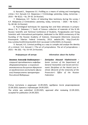9. Канузель А.Е. Криминальный профайлинг как способ составления и анализа личности преступника / А.Е. Канузель // Искусство правоведения. The Art of Law. - 2023. - № 2(6). - С. 55-59.