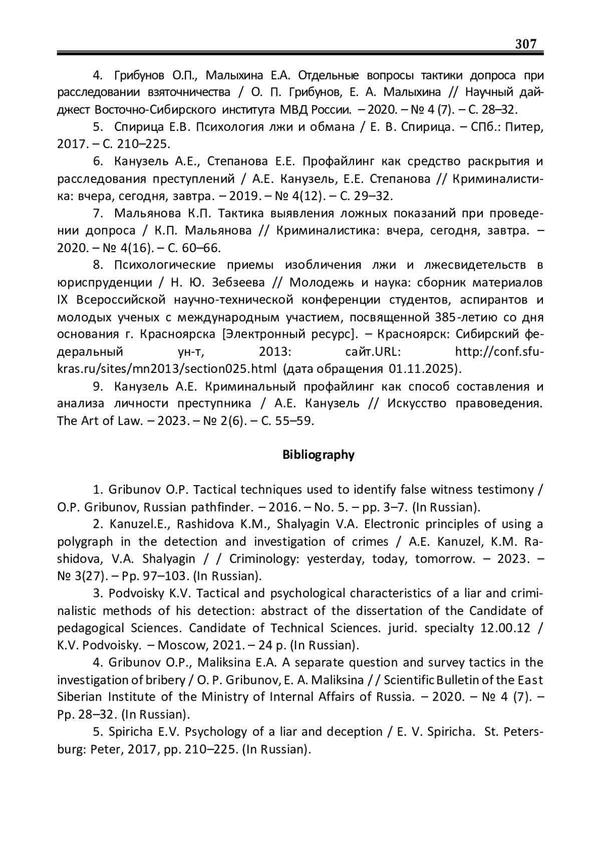 2. Канузель А.Е., Рашидова К.М., Шалягин В.А. Этические принципы применения полиграфа при раскрытии и расследовании преступлений / А.Е. Канузель, К.М. Рашидова, В.А. Шалягин // Криминалистика: вчера, сегодня, завтра. - 2023. - № 3(27). - С. 97-103. EDN: UUMROG