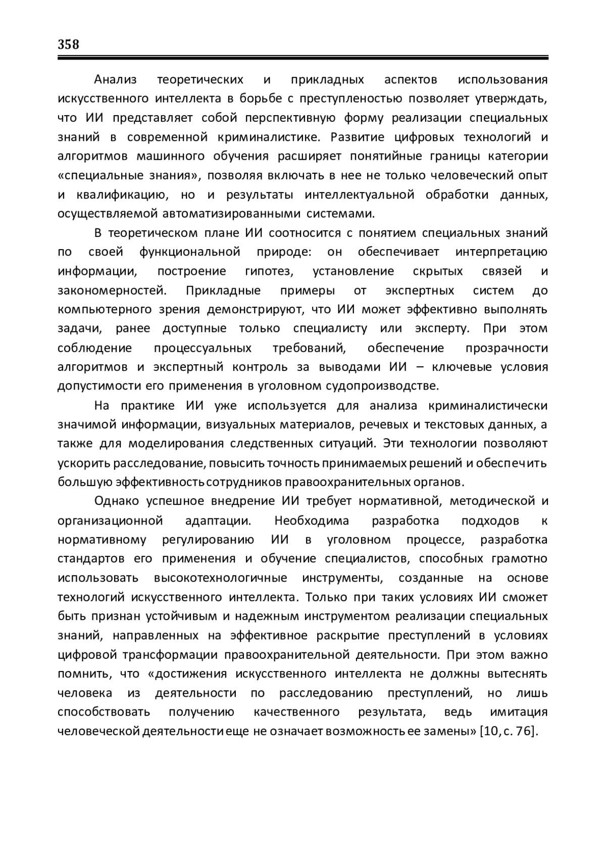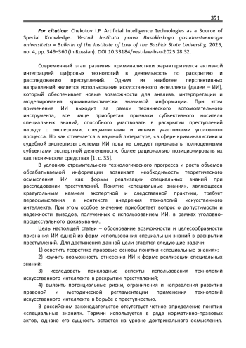 Современный этап развития криминалистики характеризуется активной интеграцией цифровых технологий в деятельность по раскрытию и расследованию преступлений. Одним из наиболее перспективных направлений является использование искусственного интеллекта (далее – ИИ), который обеспечивает новые возможности для анализа, интерпретации и моделирования криминалистически значимой информации. При этом применение ИИ выходит за рамки технического вспомогательного инструмента, все чаще приобретая признаки субъективного носителя специальных знаний, способного участвовать в раскрытии преступлений наряду с экспертами, специалистами и иными участниками уголовного процесса. Но как отмечается в научной литературе, «в сфере криминалистики и судебной экспертизы системы ИИ пока не следует признавать полноценными субъектами экспертной деятельности, более рационально позиционировать их как технические средства»