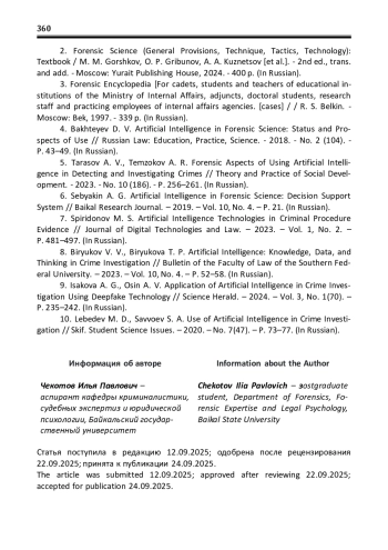 10. Лебедев М. Д., Саввоев С. А. Использование искусственного интеллекта в расследовании преступлений / М.Д. Лебедев, С.А. Саввоев // Скиф. Вопросы студенческой науки. - 2020. - № 7(47). - С. 73-77. EDN: RLHGZO