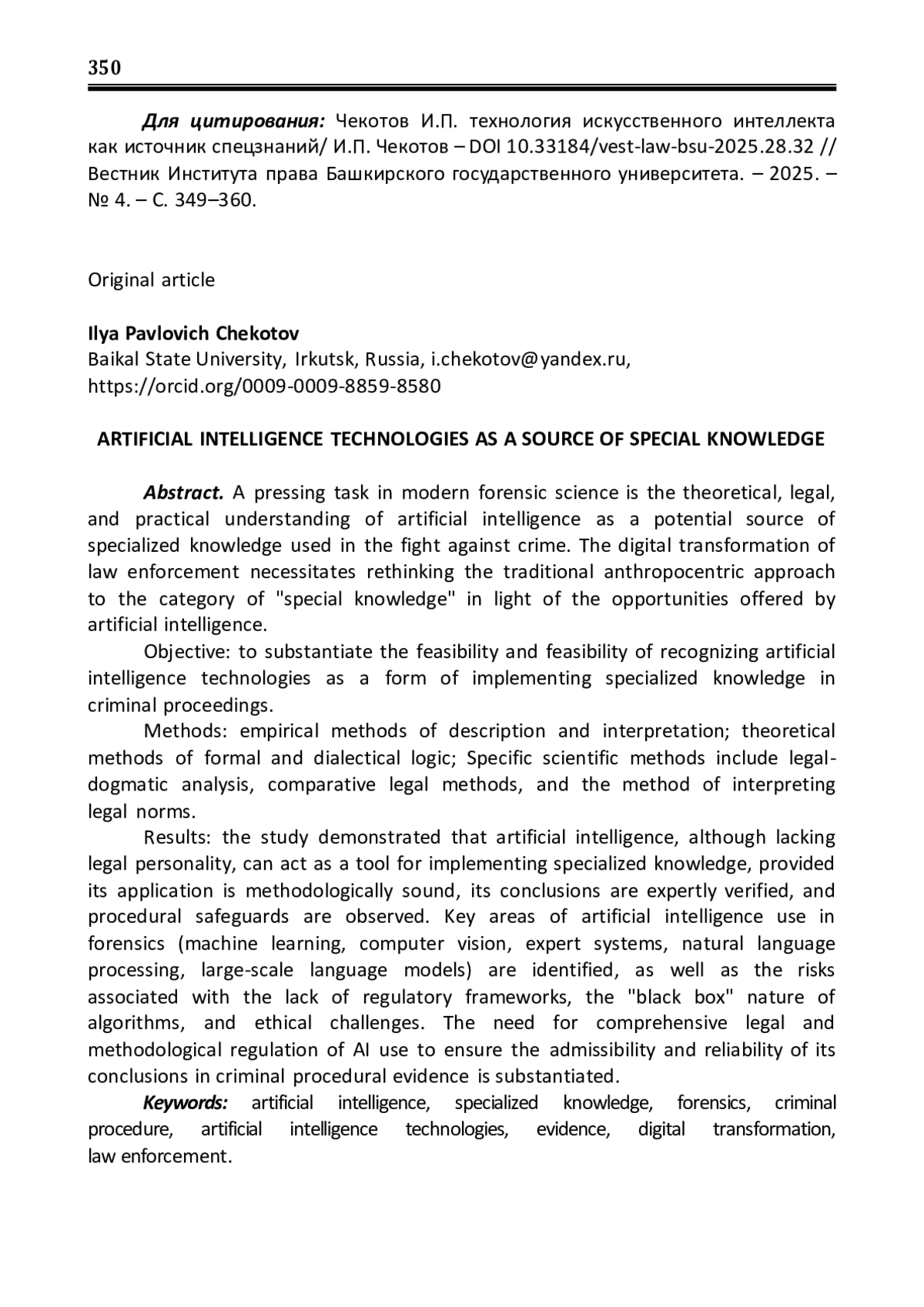 Актуальной задачей современной криминалистики является теоретико-правовое и практическое осмысление искусственного интеллекта в качестве потенциального источника специальных знаний, используемых в борьбе с преступностью. В условиях цифровой трансформации правоохранительной деятельности возникает необходимость переосмысления традиционного антропоцентричного подхода к категории «специальные знания» с учетом возможностей, предоставляемых искусственным интеллектом. Цель: обоснование возможности и целесообразности признания технологий искусственного интеллекта одной из форм реализации специальных знаний в уголовном судопроизводстве. Методы: эмпирические методы описания и интерпретации; теоретические методы формальной и диалектической логики; частнонаучные методы – юридико-догматический анализ, сравнительно-правовой метод, метод толкования правовых норм. Результаты: исследование показало, что искусственный интеллект, не обладая правосубъектностью, может выступать в качестве инструмента реализации специальных знаний при условии его методологически обоснованного применения, экспертной верификации выводов и соблюдения процессуальных гарантий. Выявлены ключевые направления использования искусственного интеллекта в криминалистике (машинное обучение, компьютерное зрение, экспертные системы, обработка естественного языка, большие языковые модели), а также риски, связанные с отсутствием нормативного регулирования, «черным ящиком» алгоритмов и этическими вызовами. Обоснована необходимость комплексного правового и методического регулирования применения ИИ для обеспечения допустимости и надежности его выводов в уголовно-процессуальном доказывании