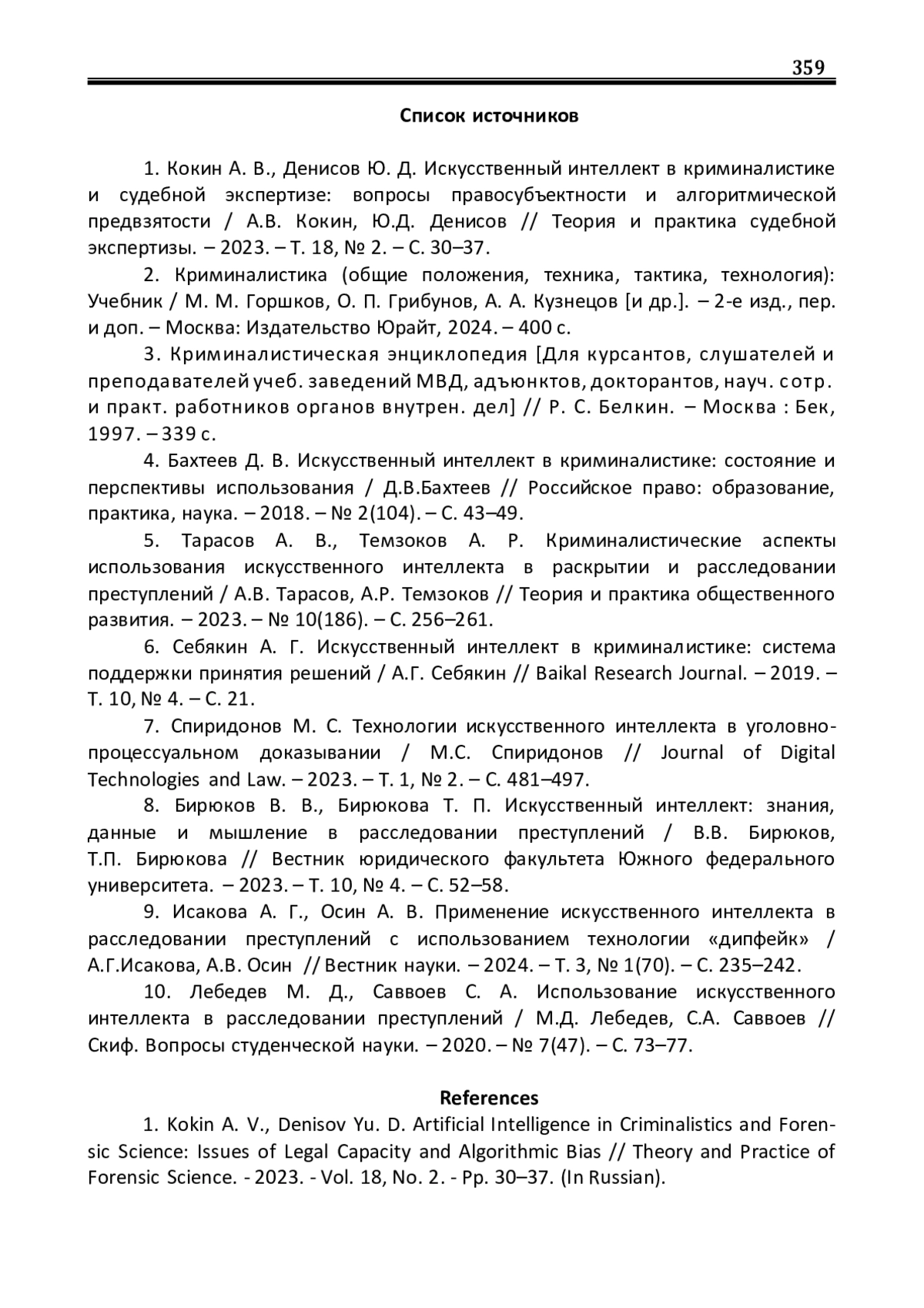 1. Кокин А. В., Денисов Ю. Д. Искусственный интеллект в криминалистике и судебной экспертизе: вопросы правосубъектности и алгоритмической предвзятости / А.В. Кокин, Ю.Д. Денисов // Теория и практика судебной экспертизы. - 2023. - Т. 18, № 2. - С. 30-37. EDN: DNMRLF