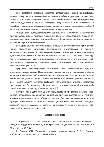 1. Хрусталев В.Н. На повестке дня утверждение профессионального стандарта “Судебный эксперт” / В.Н. Хрусталев // Судебная экспертиза. - 2023. - № 3 (75). - С. 107-124. EDN: IUPMMK