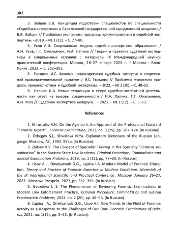 4. Усов А.И. Современная модель судебно-экспертного образования / А.И. Усов, Г.Г. Омельянюк, И.А. Лапина // Теория и практика судебной экспертизы в современных условиях: материалы IX Международной научно-практической конференции, Москва, 26-27 января 2023 г. - Москва: Блок-Принт, 2023. - С. 352-355. EDN: CCVVWJ