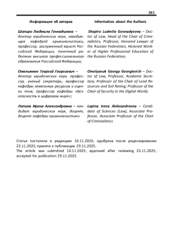 6. Лапина И.А. Новые тенденции в сфере судебно-экспертной деятельности как ответ на вызовы современности / И.А. Лапина, Г.Г. Омельянюк, А.И. Усов // Судебная экспертиза Беларуси. - 2021. - № 1 (12). - С. 5-13. EDN: NXPXEE
