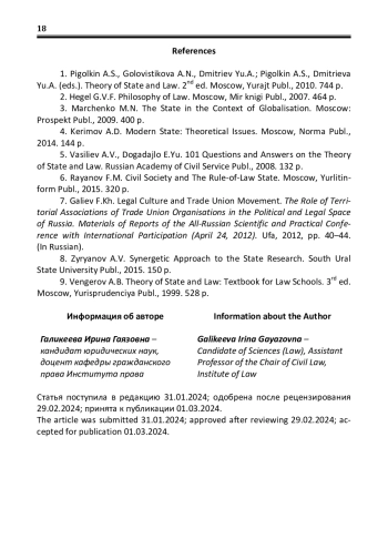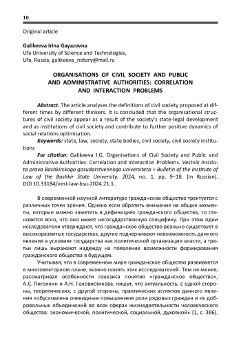 ГАЛИКЕЕВА И. Г. ОРГАНИЗАЦИОННЫЕ СТРУКТУРЫ ГРАЖДАНСКОГО ОБЩЕСТВА И ОРГАНЫ ГОСУДАРСТВЕННОЙ ВЛАСТИ И УПРАВЛЕНИЯ: ПРОБЛЕМЫ СООТНОШЕНИЯ И ВЗАИМОДЕЙСТВИЯ // ВЕСТНИК ИНСТИТУТА ПРАВА БАШКИРСКОГО ГОСУДАРСТВЕННОГО УНИВЕРСИТЕТА. 2024. № 1 (21)