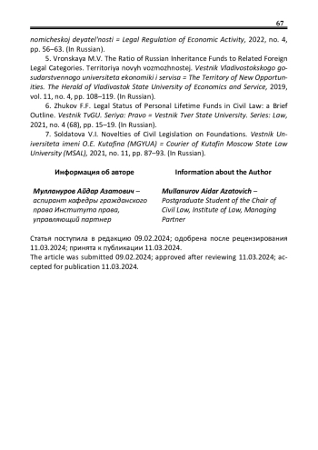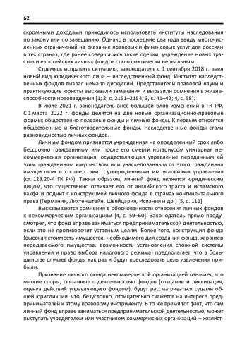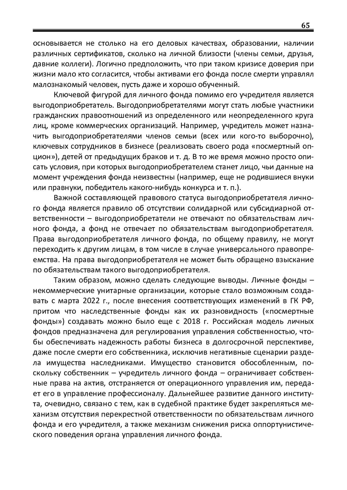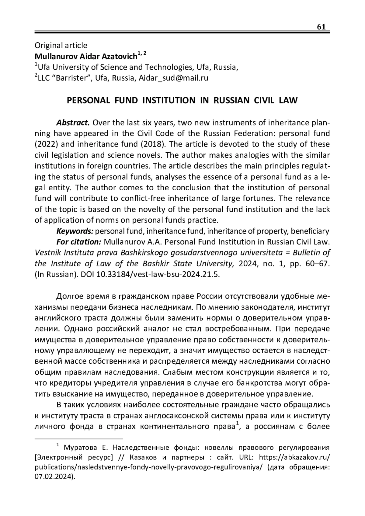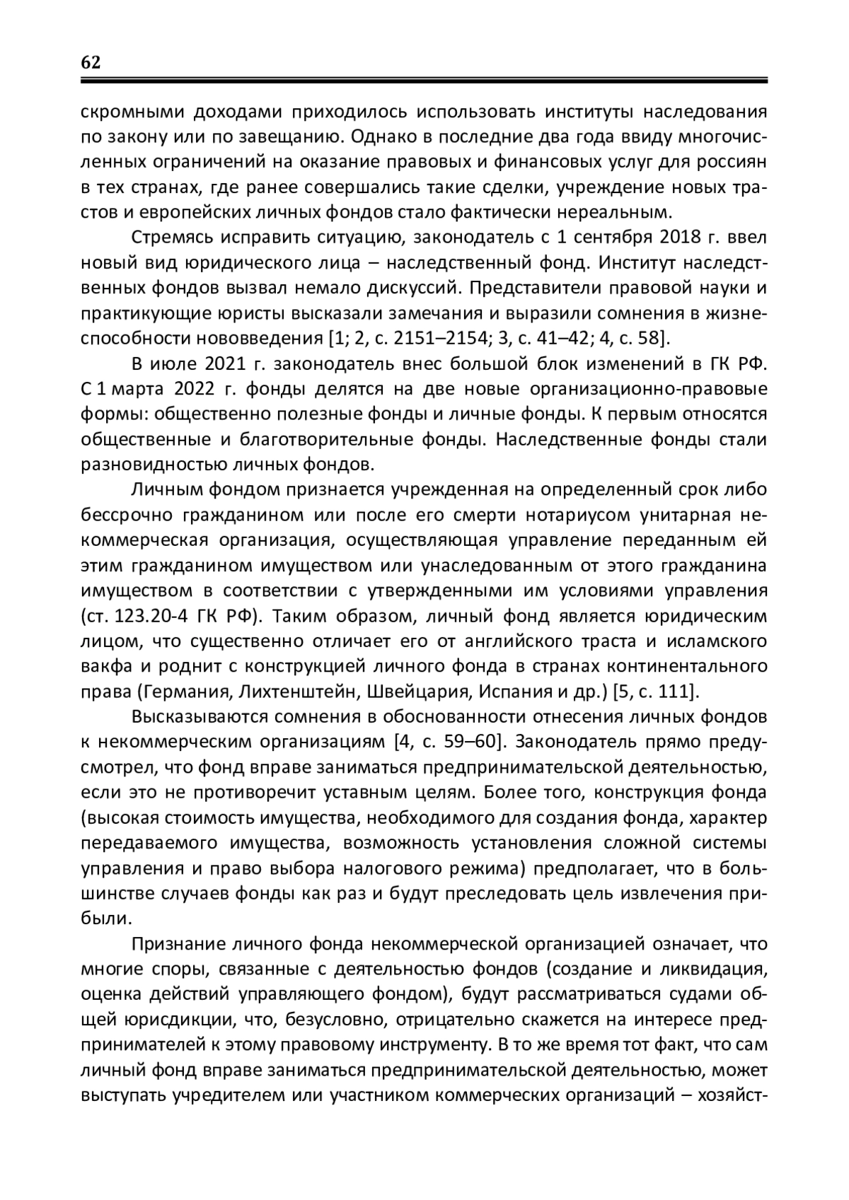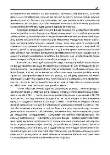 За последние шесть лет в ГК РФ появились два новых и нструмента наследственного планирования – личный фонд (с 2022 г.) и наследственный фонд (с 2018 г.). Статья посвящена исследованию указанных новелл гражданского законодательства и науки. Автор проводит аналогии со схожими институтами в зарубежных странах. В статье описаны основные положения, регулирующие статус личных фондов, проанализирована сущность личного фонда как юридического лица. Автор приходит к выводу, что институт личного фонда будет способствовать бесконфликтному наследованию крупных состояний. Актуальность темы обусловлена новизной института личного фонда, отсутствием сложившейся практики применения норм о личных фондах