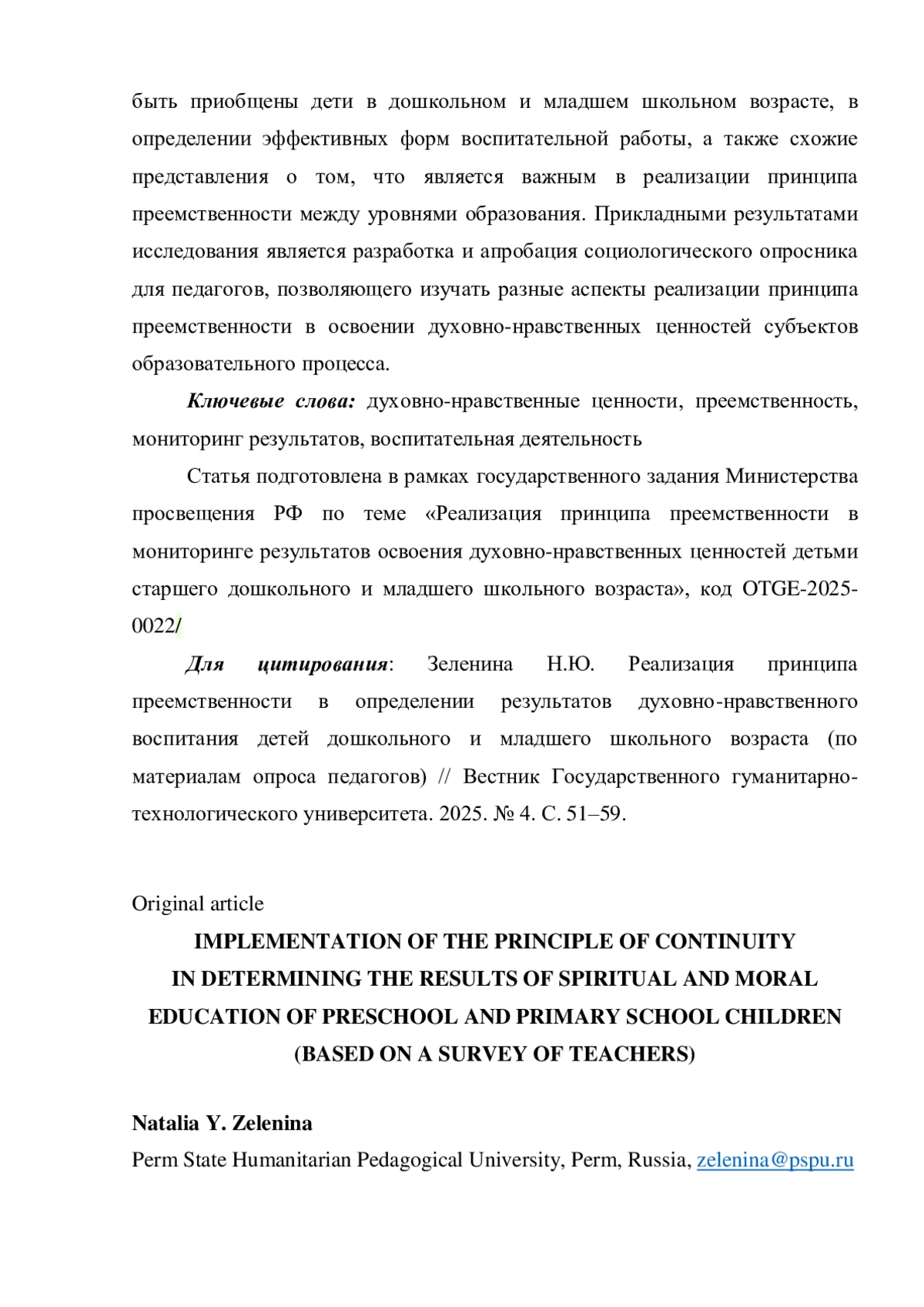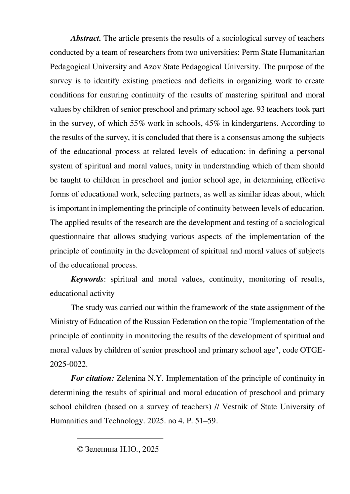 В статье приводятся результаты социологического опроса педагогов, проведенного коллективом исследователей двух вузов: Пермский государственный гуманитарно-педагогический университет и Азовский государственный педагогический университет. Цель проводимого опроса - выявить имеющиеся практики и дефициты организации работы по созданию условий обеспечения преемственности результатов освоения духовно-нравственных ценностей детьми старшего дошкольного и младшего школьного возраста. В опросе приняли участие 93 педагога, из которых 55 % работают в школах, 45 % в детских садах. По результатам проведенного опроса делается вывод о консенсусе субъектов образовательного процесса смежных уровней образования: в определении личной системы духовно-нравственных ценностей, единство в понимании, того к каким из них должны быть приобщены дети в дошкольном и младшем школьном возрасте, в определении эффективных форм воспитательной работы, а также схожие представления о том, что является важным в реализации принципа преемственности между уровнями образования. Прикладными результатами исследования является разработка и апробация социологического опросника для педагогов, позволяющего изучать разные аспекты реализации принципа преемственности в освоении духовно-нравственных ценностей субъектов образовательного процесса.
