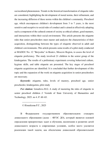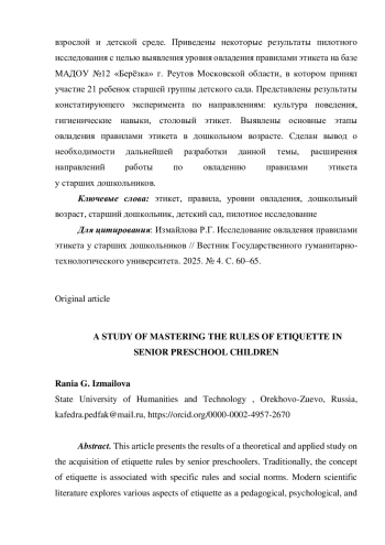 В статье представлены результаты теоретического и прикладного исследования по овладению правилами этикета у старших дошкольников. Традиционно понятие этикета связывается с определенными правилами, общественными нормами. В современной научной литературе существуют различные аспекты изучения этикета как педагогического, психологического, социокультурного явления. Изучены тенденции в исторической трансформации правил этикета, которые указали на развитие норм нравственности, совершенствование и наращивание их трансляции в детское сообщество. Дошкольный возраст, предполагающий развитие ребенка во временных рамках от 3 до 7 лет, является наиболее чувствительным и восприимчивым к правилам поведения в обществе, направлен на результативное перенятие такой составляющей культурного содержания социума, каким является этическая культура, хорошие манеры поведения и взаимодействия в своем социальном окружении. Представлены правила этикета, которые должен освоить старший дошкольник, проанализированы особенности овладения ими у дошкольников с разделением видов этикета во взрослой и детской среде. Приведены некоторые результаты пилотного исследования с целью выявления уровня овладения правилами этикета на базе МАДОУ №12 «Берёзка» г. Реутов Московской области, в котором принял участие 21 ребенок старшей группы детского сада. Представлены результаты констатирующего эксперимента по направлениям: культура поведения, гигиенические навыки, столовый этикет. Выявлены основные этапы овладения правилами этикета в дошкольном возрасте. Сделан вывод о необходимости дальнейшей разработки данной темы, расширения направлений работы по овладению правилами этикета у старших дошкольников.