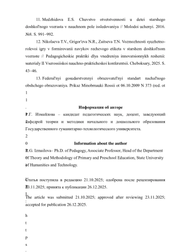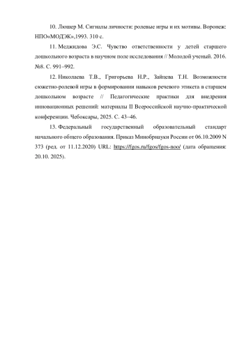 12. Николаева Т.В., Григорьева Н.Р., Зайцева Т.Н. Возможности сюжетно-ролевой игры в формировании навыков речевого этикета в старшем дошкольном возрасте // Педагогические практики для внедрения инновационных решений: материалы II Всероссийской научно-практической конференции. Чебоксары, 2025. С. 43-46. EDN: URRKBB