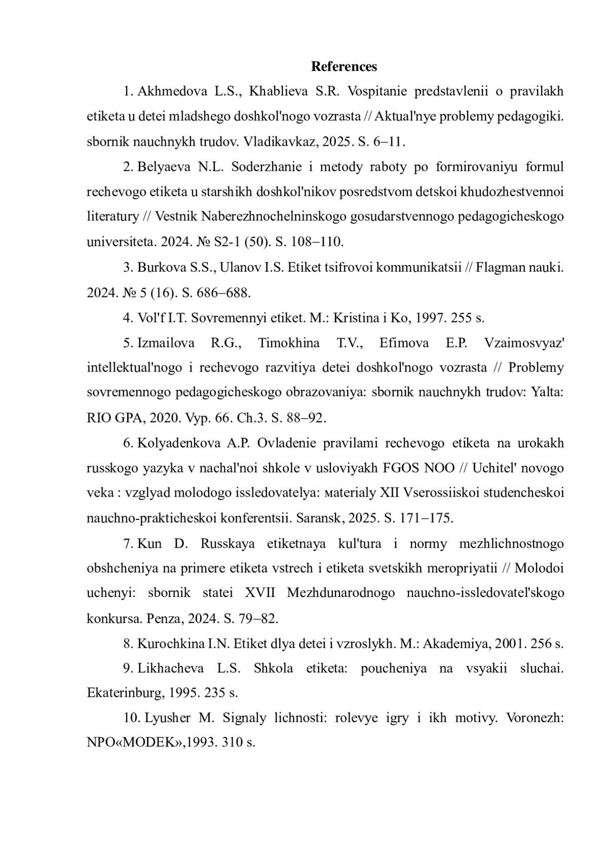 1. Ахмедова Л.С., Хаблиева С.Р. Воспитание представлений о правилах этикета у детей младшего дошкольного возраста // Актуальные проблемы педагогики: сборник научных трудов. Владикавказ, 2025. С. 6-11. EDN: POWNKY