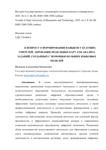 В статье рассматриваются трансформационные перспективы применения искусственного интеллекта в системе высшего педагогического образования. Актуальность исследования обусловлена стремительным развитием цифровой образовательной среды и необходимостью подготовки нового поколения педагогов, способных эффективно использовать потенциал искусственного интеллекта в своей профессиональной деятельности и соответственно формирования у него особых цифровых навыков. Проведён контент-анализ стратегических документов, определяющих искусственный интеллект как ключевой фактор производства и эффективного взаимодействия акторов в современном социально-экономическом пространстве цифровой экономики. Реализован обзор возможностей искусственного интеллекта для образования в разрезе учета индивидуальных особенностей обучающихся, средств учебной деятельности и автоматизации рутинных задач, формирования цифровых навыков и реализации саморефлексии. В методической части статьи презентованы итоги нескольких экспериментов в рамках функционала больших языковых моделей «генерация учебного контента». Объектом приложения выбрана дисциплина «Экономика» для студентов направления подготовки «Педагогическое образование», профили «История. Обществознание». Итоговый результат генерации проанализирован в разрезе конкретных предметных результатов, основных видов деятельности и программного содержания, обозначенных в Федеральных рабочих программах. В итоге эксперимента получены модельные карты для анализа и сравнения мотивирующего задания, задания «Интересная подача материала», разноуровневых задач, созданных с помощью больших языковых моделей.