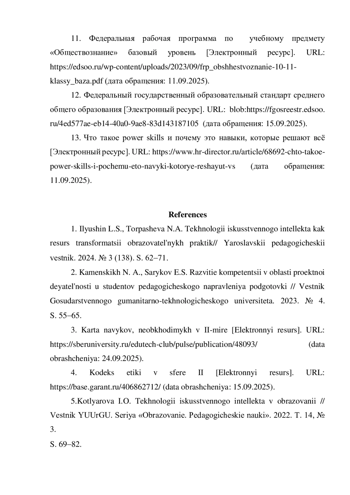 1. Илюшин Л.С., Торпашева Н.А. Технологии искусственного интеллекта как ресурс трансформации образовательных практик // Ярославский педагогический вестник. 2024. № 3 (138). С. 62-71. EDN: ADWMMG