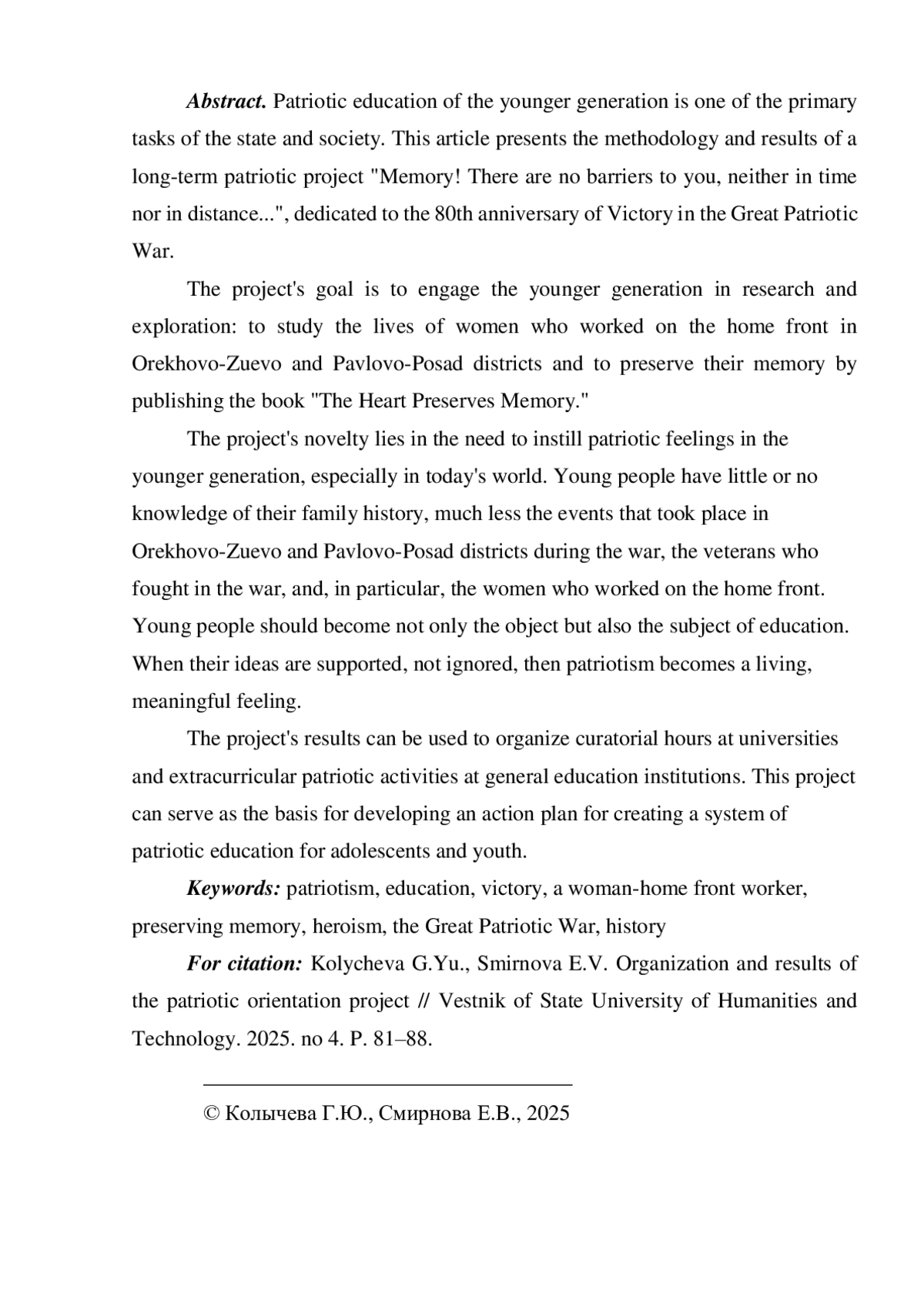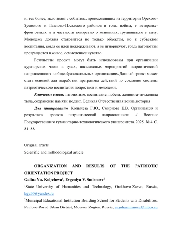 12. Смирнова С.И. Патриотическое воспитание младших школьников в процессе исследовательской деятельности // Начальная школа. 2022. № 9. С. 16-20. EDN: FLTTMH