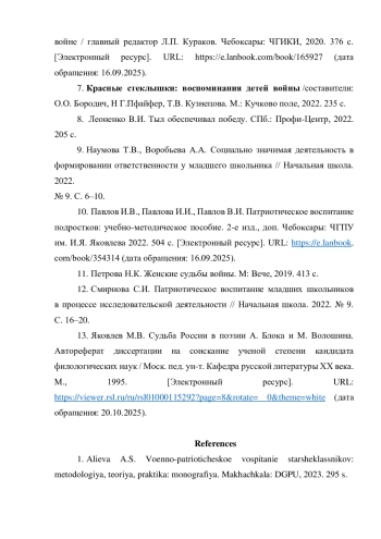 6. Духовно-нравственное и патриотическое воспитание молодежи: сборник научных статей по итогам Всероссийской научно-практической конференции, посвященной 75-летию Победы в Великой Отечественной войне / главный редактор Л.П. Кураков. Чебоксары: ЧГИКИ, 2020. 376 с. [Электронный ресурс]. URL: https://e.lanbook.com/book/165927(датаобращения:16.09.2025).