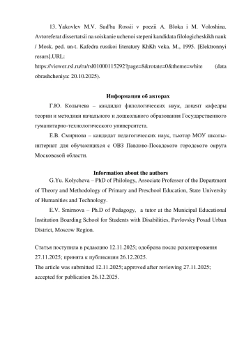 13. Яковлев М.В. Судьба России в поэзии А. Блока и М. Волошина. Автореферат диссертации на соискание ученой степени кандидата филологических наук / Моск. пед. ун-т. Кафедра русской литературы ХХ века. М., 1995. [Электронный ресурс]. URL: https://viewer.rsl.ru/ru/rsl01000115292?page=8&rotate=0&theme=white(датаобращения:20.10.2025). EDN: ZJXQZB
