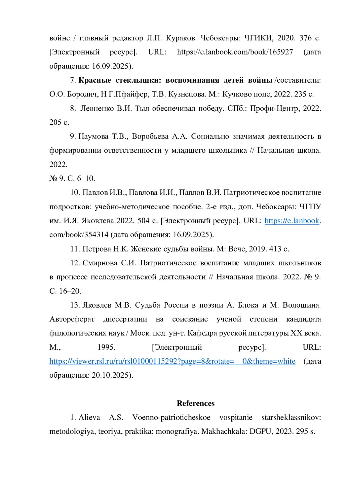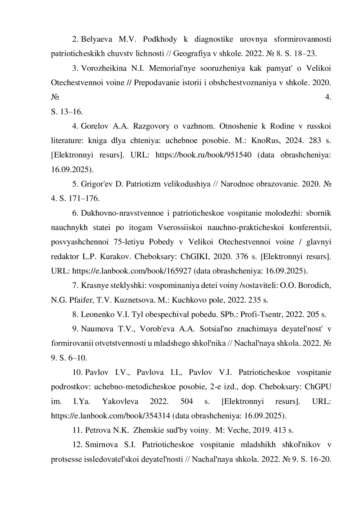 10. Павлов И.В., Павлова И.И., Павлов В.И. Патриотическое воспитание подростков: учебно-методическое пособие. 2-е изд., доп. Чебоксары: ЧГПУ им. И.Я. Яковлева 2022. 504 с. [Электронный ресурс]. URL: https://e.lanbook.com/book/354314(датаобращения:16.09.2025).