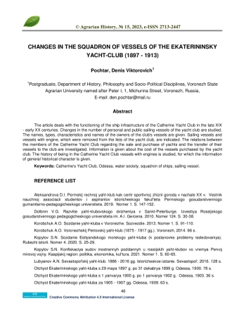 1. Aleksandrova D.I. Permskij rechnoj yaht-klub kak centr sportivnoj zhizni goroda v nachale XX v. Vestnik nauchnoj associacii studentov i aspirantov istoricheskogo fakulteta Permskogo gosudarstvennogo gumanitarno-pedagogicheskogo universiteta. 2019. Nomer 1. S. 147-152.
