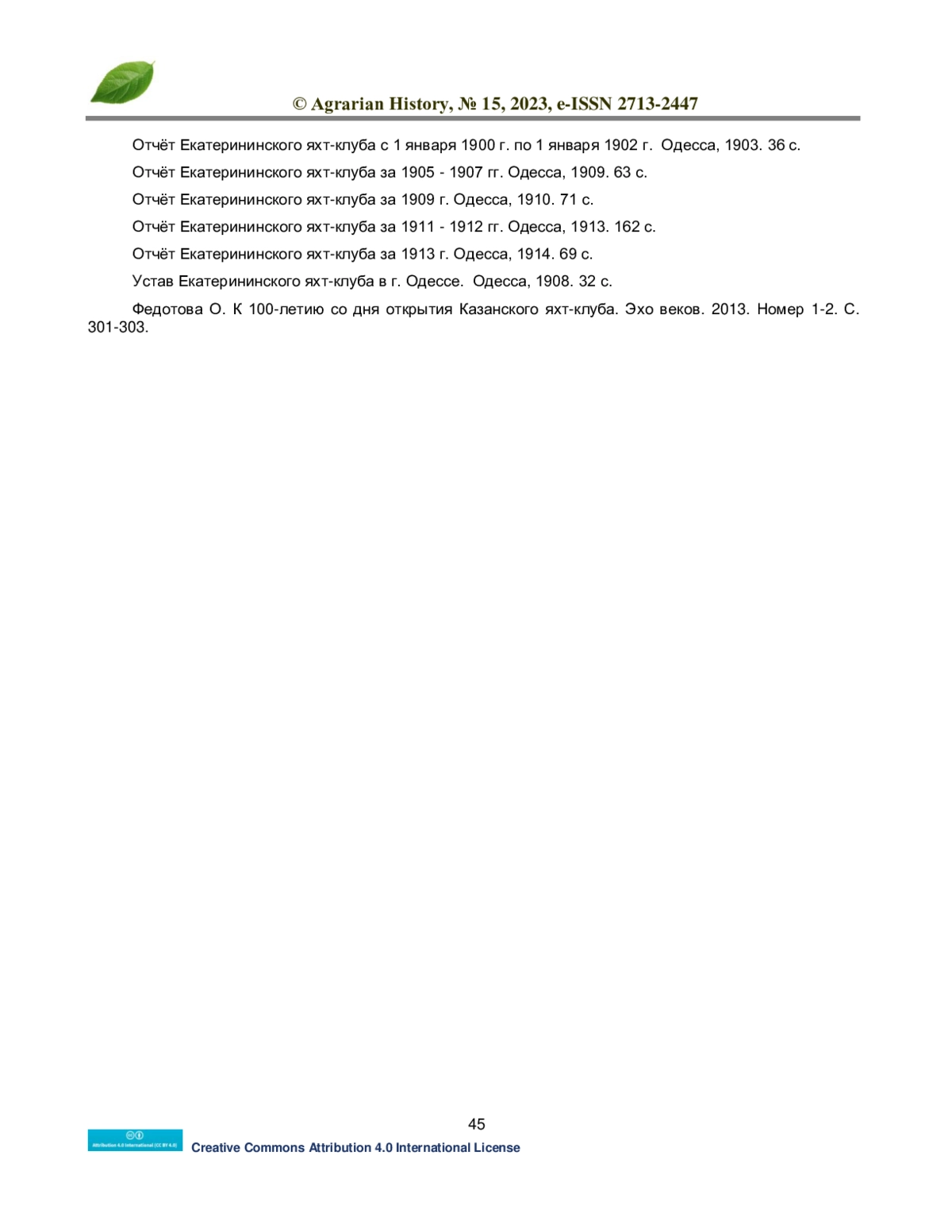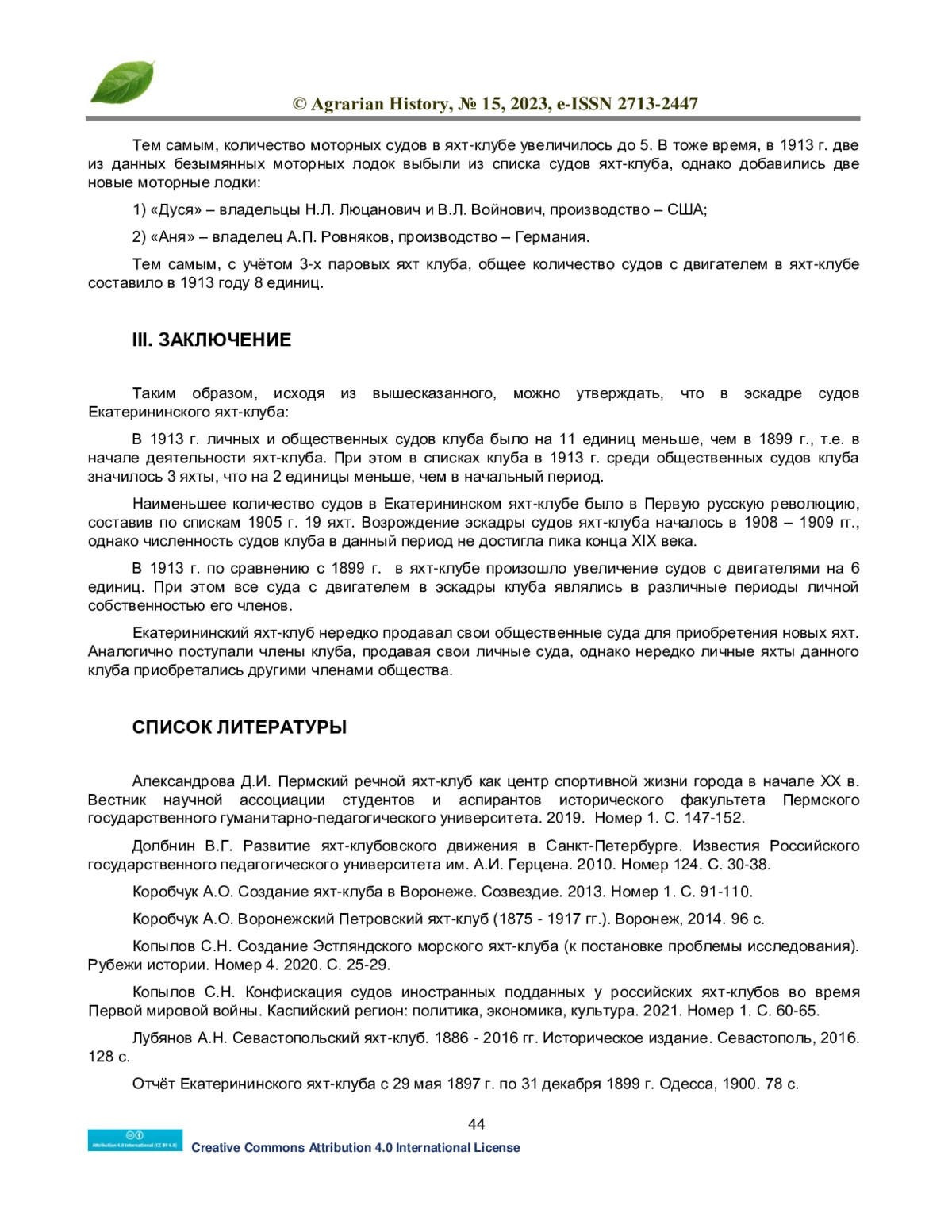6. Kopylov S.N. Konfiskaciya sudov inostrannyh poddannyh u rossijskih yaht-klubov vo vremya Pervoj mirovoj vojny. Kaspijskij region: politika, ekonomika, kultura. 2021. Nomer 1. S. 60-65. EDN: VDDEYC