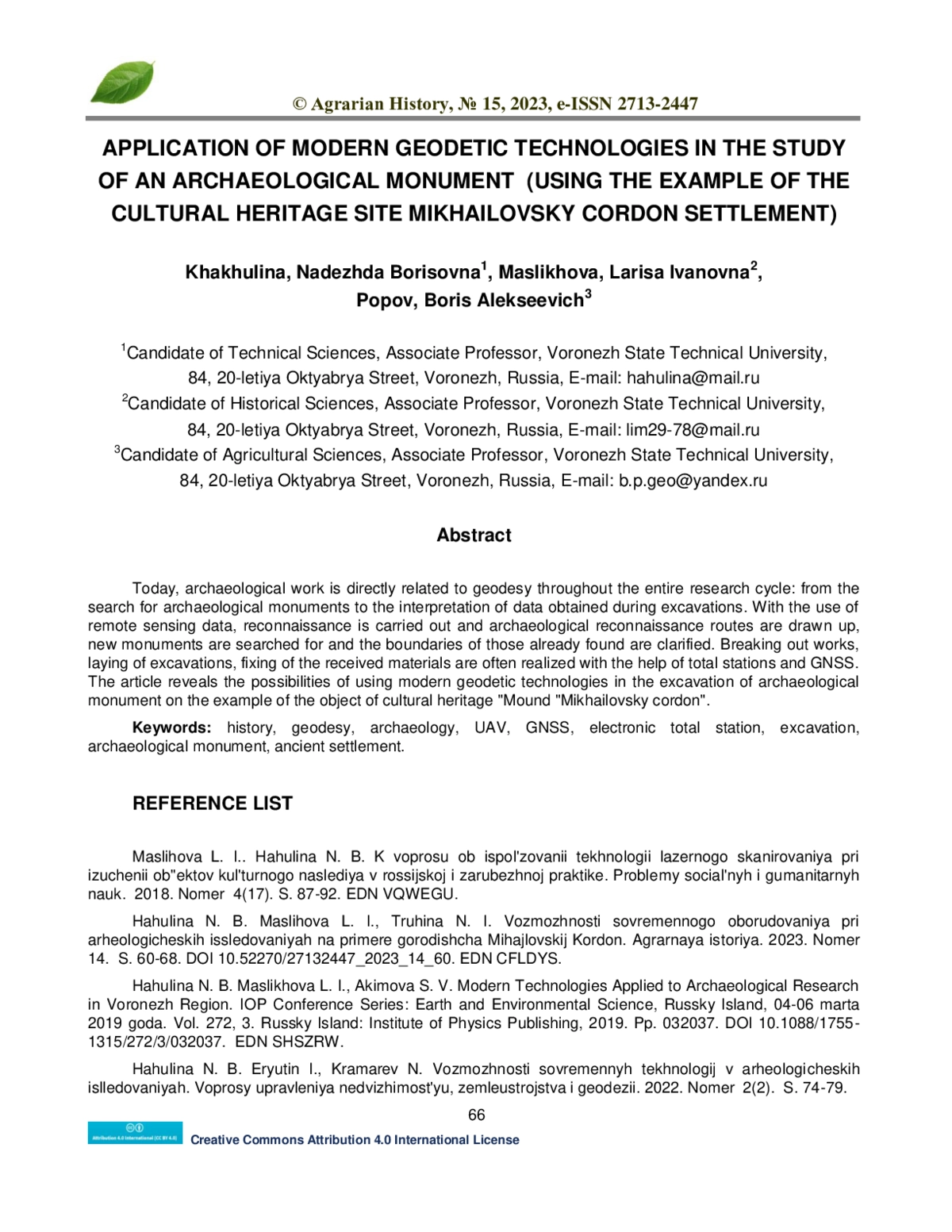 Сегодня археологические работы напрямую связаны с геодезией на протяжении всего цикла исследования: начиная от поиска археологических памятников и заканчивая интерпретацией данных, полученных в процессе раскопок. С использованием данных дистанционного зондирования Земли проводится рекогносцировка и составление маршрутов археологических разведок, поиск новых памятников и уточнение границ уже найденных. Разбивочные работы, закладка раскопов, фиксация полученных материалов часто реализуются при помощи тахеометров и ГНСС. В статье раскрываются возможности использования современных геодезических технологий при раскопках археологического памятника на примере объекта культурного наследия «Городище «Михайловский кордон».