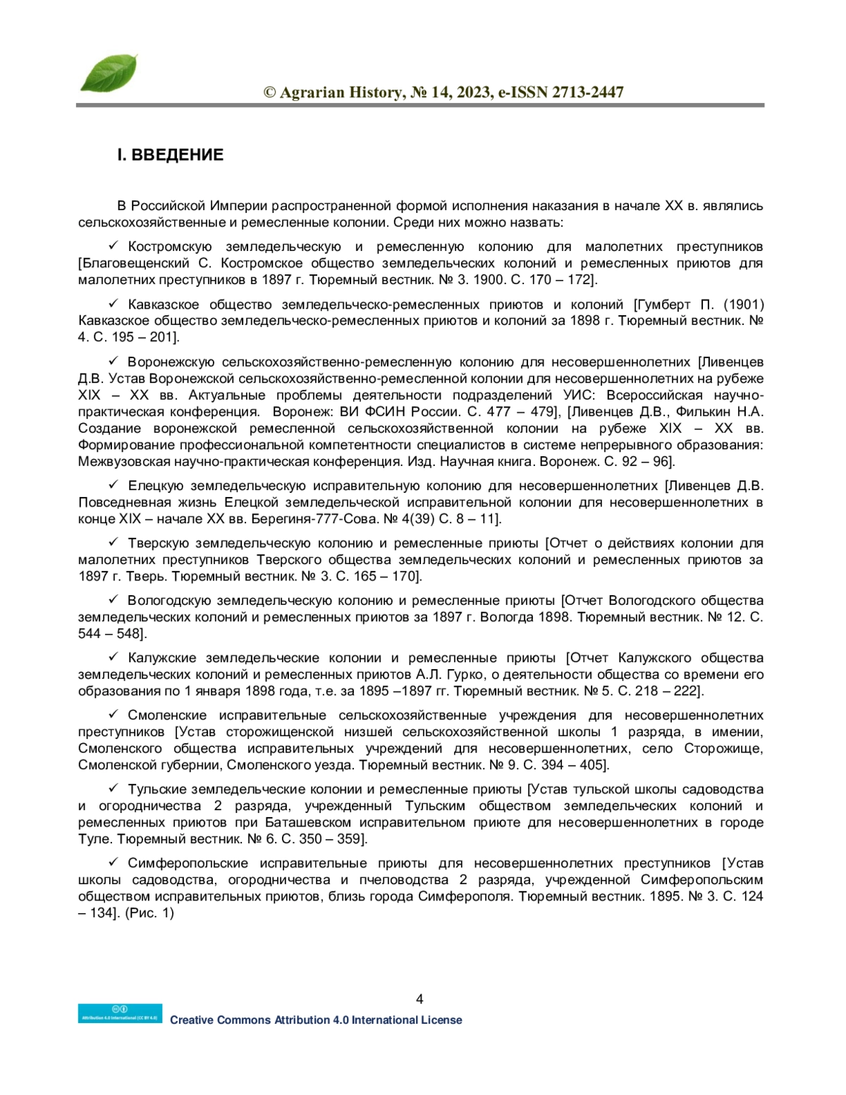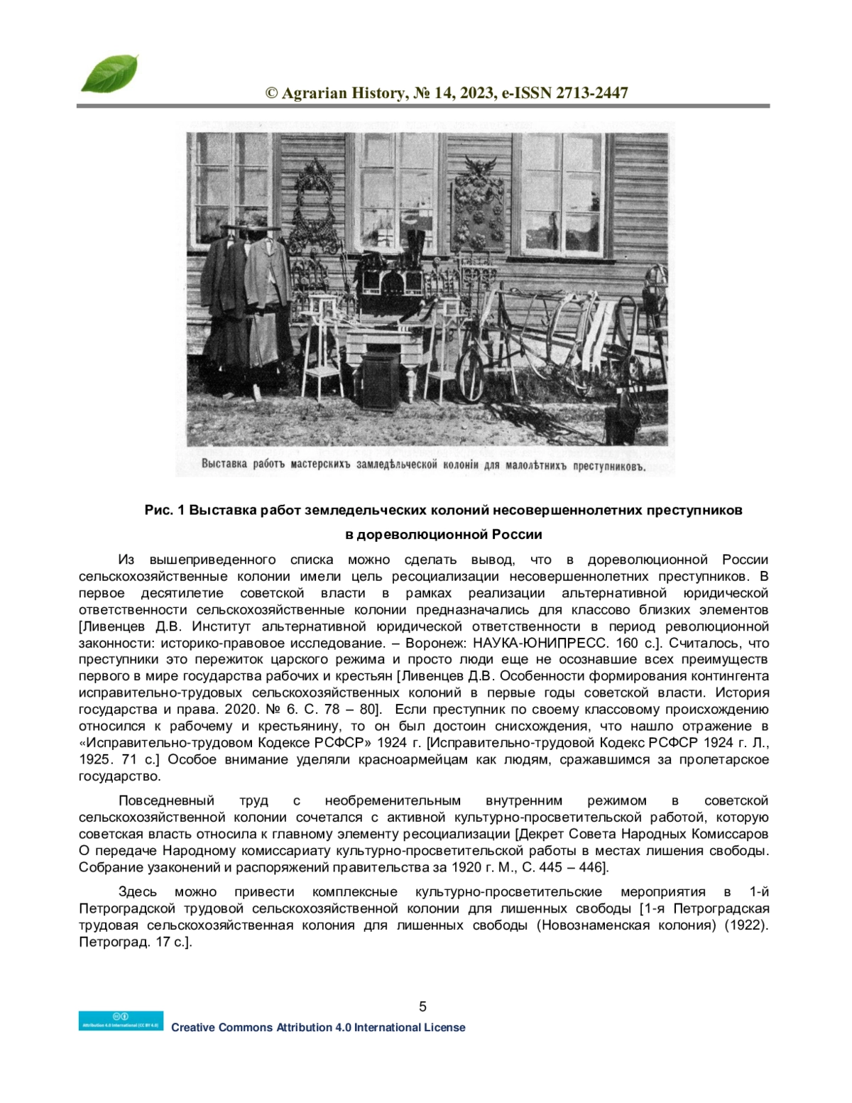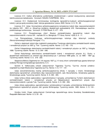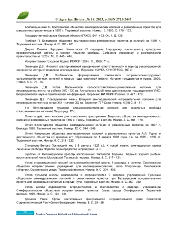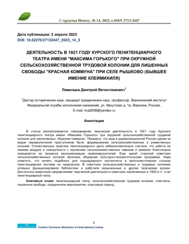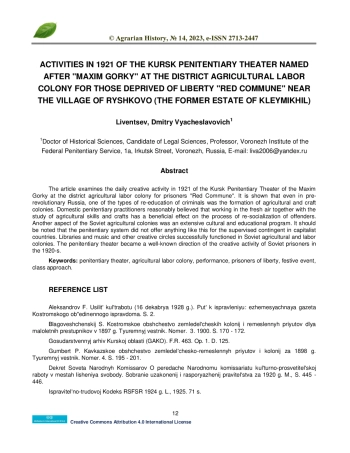В статье рассматривается повседневная творческая деятельность в 1921 году Курского пенитенциарного театра имени «Максима Горького» при окружной сельскохозяйственной трудовой колонии для заключенных «Красная коммуна». Показано, что еще в дореволюционной России одним из видов перевоспитания преступников было формирование сельскохозяйственных и ремесленных колоний. Отечественные практики пенитенциарного дела небезосновательно считали, что работа на свежем воздухе в совокупности с изучением сельскохозяйственных навыков и ремесел благотворно сказывается на процессе ресоциализации правонарушителей. Еще одной стороной советских сельскохозяйственных колоний являлась обширная культурно-просветительская программа. Надо отметить, что ничего подобного для поднадзорного контингента в капиталистических странах пенитенциарная система не предлагала. В советских сельскохозяйственных и трудовых колониях успешно функционировали библиотеки и работали музыкальные и другие творческие кружки. Достаточно известным направлением творческой деятельности советских заключенных в 1920-е гг. стал пенитенциарный театр.