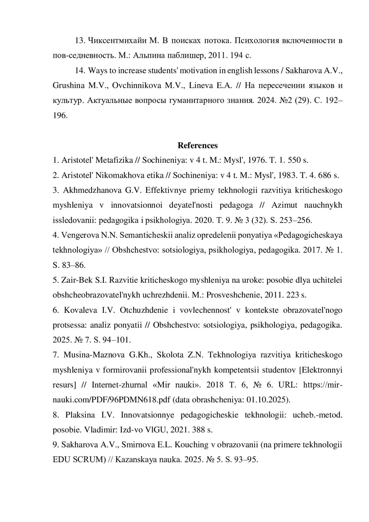 7. Мусина-Мазнова Г.Х., Сколота З.Н. Технология развития критического мышления в формировании профессиональных компетенций студентов [Электронный ресурс] / Интернет-журнал “Мир науки”. 2018 Т. 6, № 6. URL: https://mir-nauki.com/PDF/96PDMN618.pdf (дата обращения: 01.10.2025).