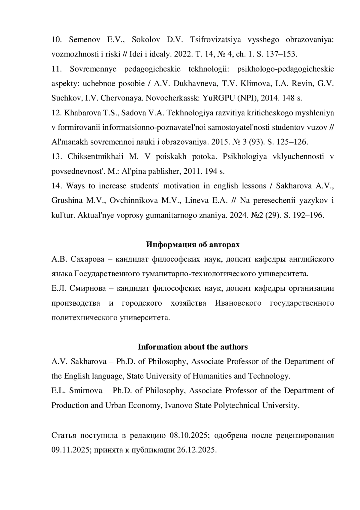 14. Ways to increase students’ motivation in english lessons / Sakharova A.V., Grushina M.V., Ovchinnikova M.V., Lineva E.A. // На пересечении языков и культур. Актуальные вопросы гуманитарного знания. 2024. №2 (29). С. 192-196. EDN: GSMHZE