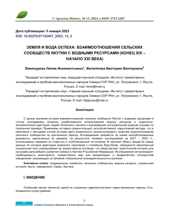 С целью изучения истории взаимоотношений сельских сообществ Якутии с водными ресурсами в статье исследованы вопросы хозяйственного использования водных ресурсов и социальноэкономической адаптации людей Оспехского наслега к возникавшим экстремальным водным угрозам на локальном примере. Применены историко-сравнительный, ретроспективный, нарративный методы, что в комплексе с методами устной истории дало возможность реконструировать практики водопользования сельского сообщества за длительный период. Исследование опирается на ранее неопубликованные документы, извлеченные из архивов, на результаты полевых исследований за 2021 – 2022 гг.; использованы сведения из открытых и опубликованных источников. В научный оборот вводятся новые данные по истории адаптации коренного населения к стихийным бедствиям, освещается накопленный социальный опыт реагирования на чрезвычайные ситуации, что представляет практический интерес для программ дальнейшего развития Севера и Арктики Российской Федерации. Исследование актуализирует необходимость мониторинга, превентивных мер для минимизации и профилактики последствий наводнений, угрожающих устойчивой и безопасной жизнедеятельности в регионе.