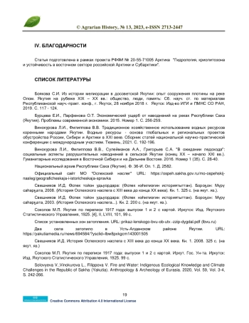 1. Boyakova S.I. Iz istorii melioracii v dosovetskoj YAkutii: opyt sooruzheniya plotiny na reke Olom. YAkutiya na rubezhe XIX XX vv.: obshchestvo, lyudi, pamyat: Sb. nauch. st. po materialam Respublikanskoj nauch.-prakt. konf., g. YAkutsk, 28 noyabrya 2018 g. YAkutsk: Izd-vo IGI i PMNS SO RAN, 2019. S. 117 - 124.