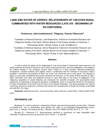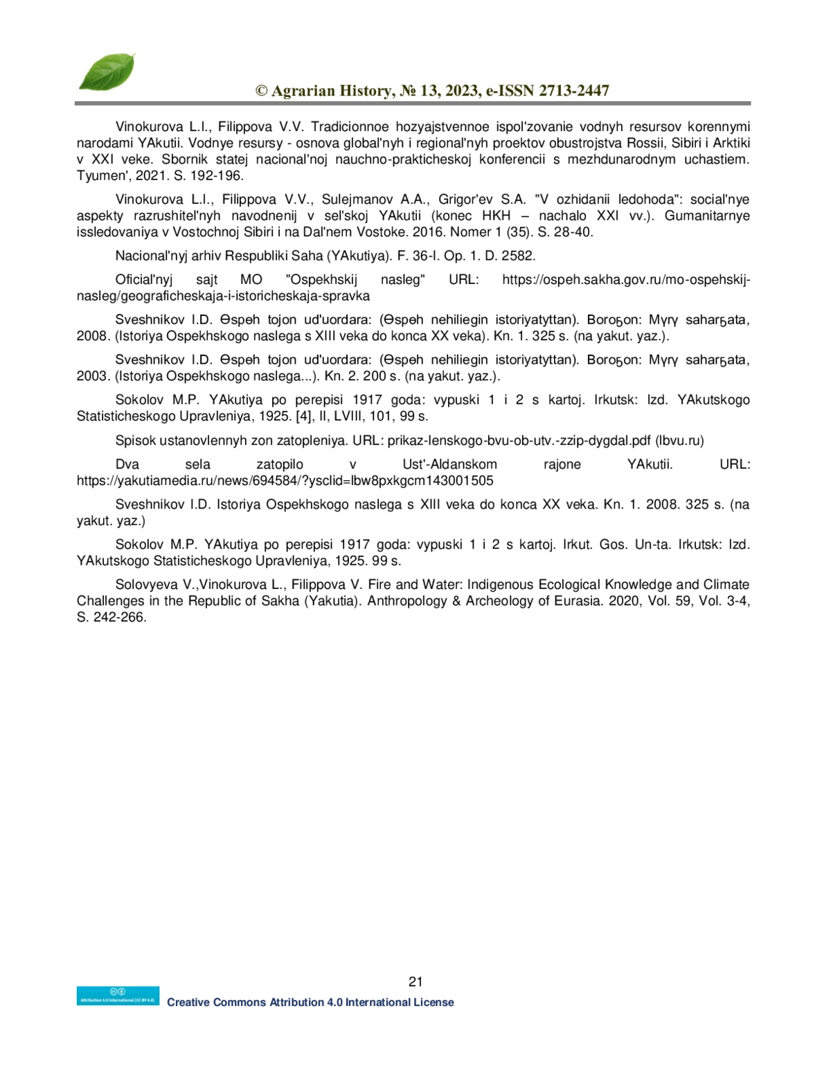 3. Vinokurova L.I., Filippova V.V. Tradicionnoe hozyajstvennoe ispolzovanie vodnyh resursov korennymi narodami YAkutii. Vodnye resursy - osnova globalnyh i regionalnyh proektov obustrojstva Rossii, Sibiri i Arktiki v XXI veke. Sbornik statej nacionalnoj nauchno-prakticheskoj konferencii s mezhdunarodnym uchastiem. Tyumen, 2021. S. 192-196.