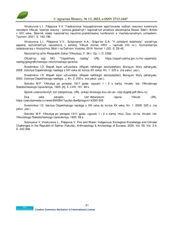 14. Solovyeva V.,Vinokurova L., Filippova V. Fire and Water: Indigenous Ecological Knowledge and Climate Challenges in the Republic of Sakha (Yakutia). AnthropologyArcheology of Eurasia/2020, Vol. 59, Vol. 3-4, S. 242-266.