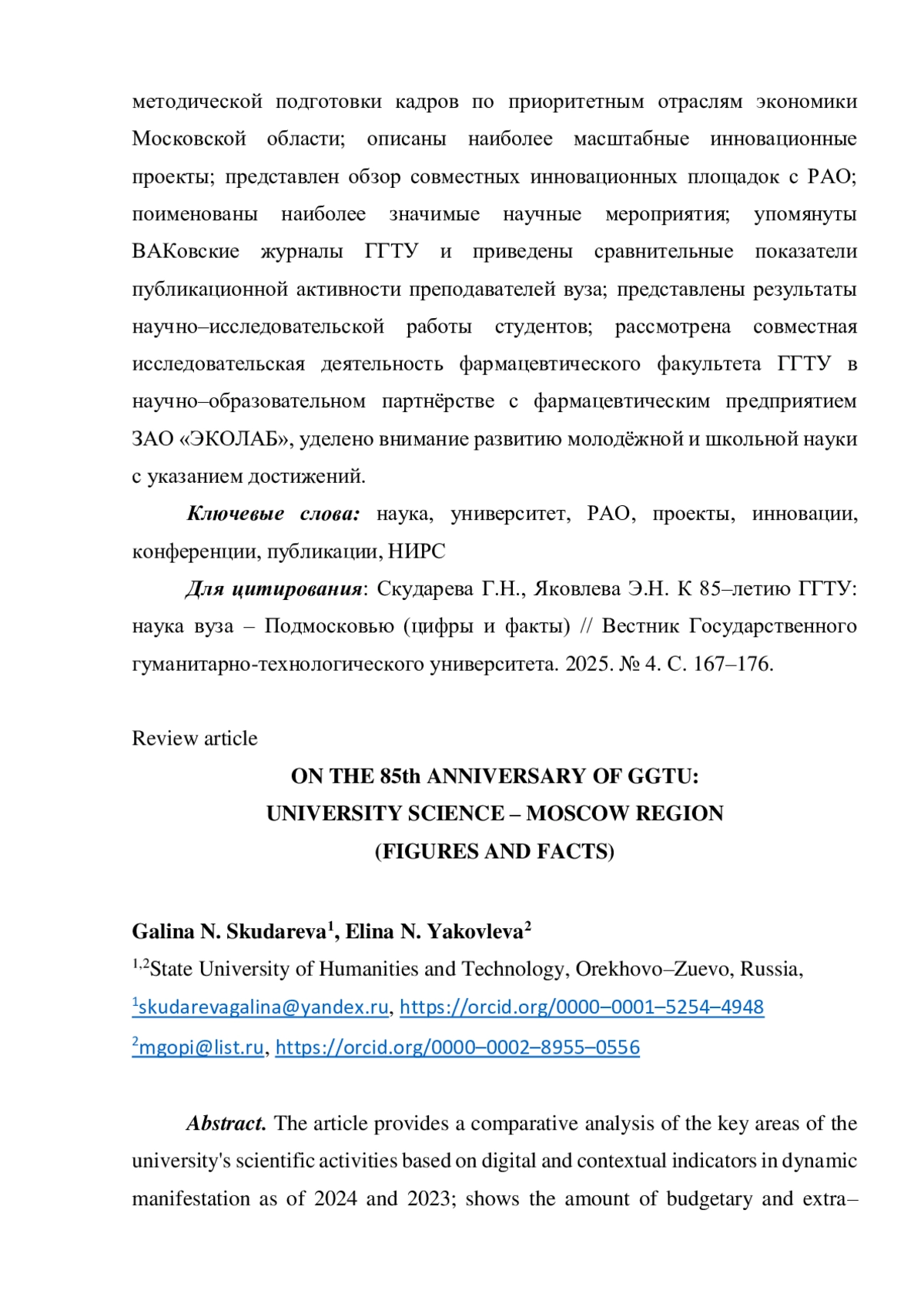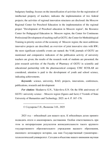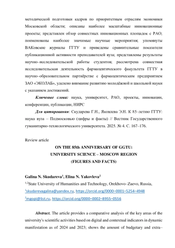 В статье осуществлён сравнительный анализ ключевых направлений научной деятельности университета на основе цифровых и контекстных показателей в динамическом проявлении по состоянию 2024 и 2023 гг.; показаны объёмы бюджетного и внебюджетного финансирования; акцентировано внимание на активизации деятельности по регистрации интеллектуальной собственности преподавателей; указано на реализацию двух федеральных проектов; раскрыта деятельность областных инновационных структур: Московского областной центра дошкольного образования в реализации регионального проекта «Развитие дошкольного образования Московской области», Ресурсного центра педагогического образования Московской области, Центра непрерывного повышения профессионального мастерства педагогических работников ГГТУ, Центра методической подготовки кадров по приоритетным отраслям экономики Московской области; описаны наиболее масштабные инновационные проекты; представлен обзор совместных инновационных площадок с РАО; поименованы наиболее значимые научные мероприятия; упомянуты ВАКовские журналы ГГТУ и приведены сравнительные показатели публикационной активности преподавателей вуза; представлены результаты научно-исследовательской работы студентов; рассмотрена совместная исследовательская деятельность фармацевтического факультета ГГТУ в научно-образовательном партнёрстве с фармацевтическим предприятием ЗАО «ЭКОЛАБ», уделено внимание развитию молодёжной и школьной науки с указанием достижений.