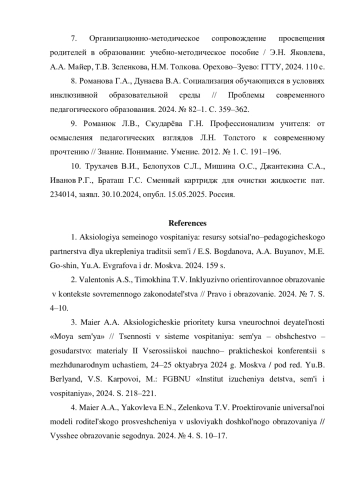 4. Майер А.А., Яковлева Э.Н., Зеленкова Т.В. Проектирование универсальной модели родительского просвещения в условиях дошкольного образования // Высшее образование сегодня. 2024. № 4. С. 10-17. EDN: CJWLXC