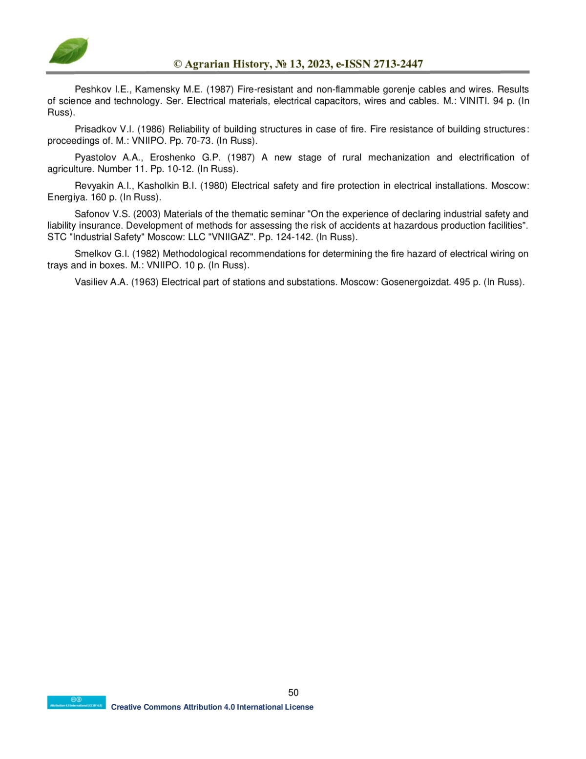 12. Revyakin A.I., Kasholkin B.I. (1980) Electrical safety and fire protection in electrical installations. Moscow: Energiya. 160 p. (In Russ).