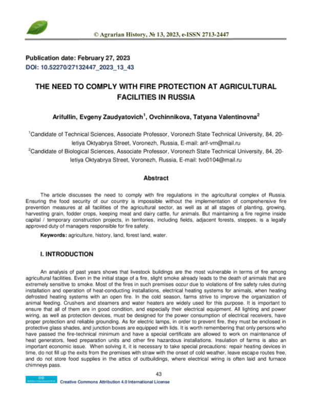 статье рассматривается необходимость соблюдения противопожарных норм в агропромышленном комплексе России. Обеспечение продовольственной безопасности нашей страны невозможно без осуществления комплексных противопожарных мер на всех объектах аграрного сектора, а также на всех этапах посадки, выращивания, уборки зерновых, кормовых культур, содержания мясомолочного скота, пушных зверей. Но поддержание противопожарного режима внутри объектов капитального/временного строительства, на территориях, включая поля, прилегающие леса, степи, является законодательно утвержденной обязанностью руководителей, ответственных за пожарную безопасность.