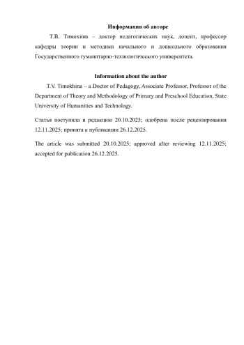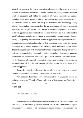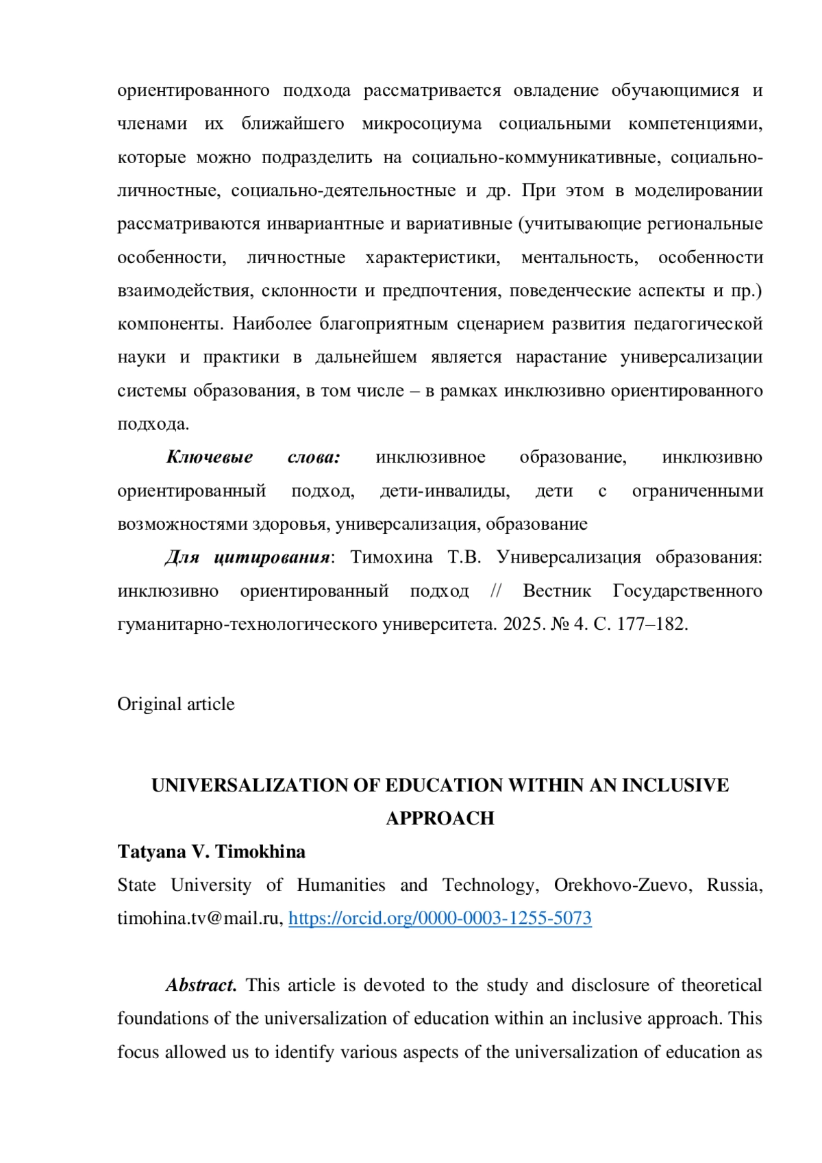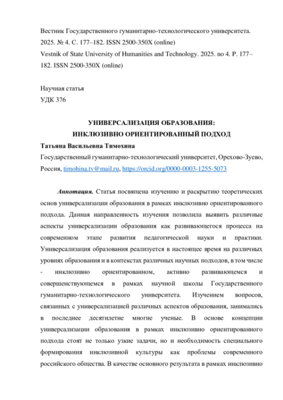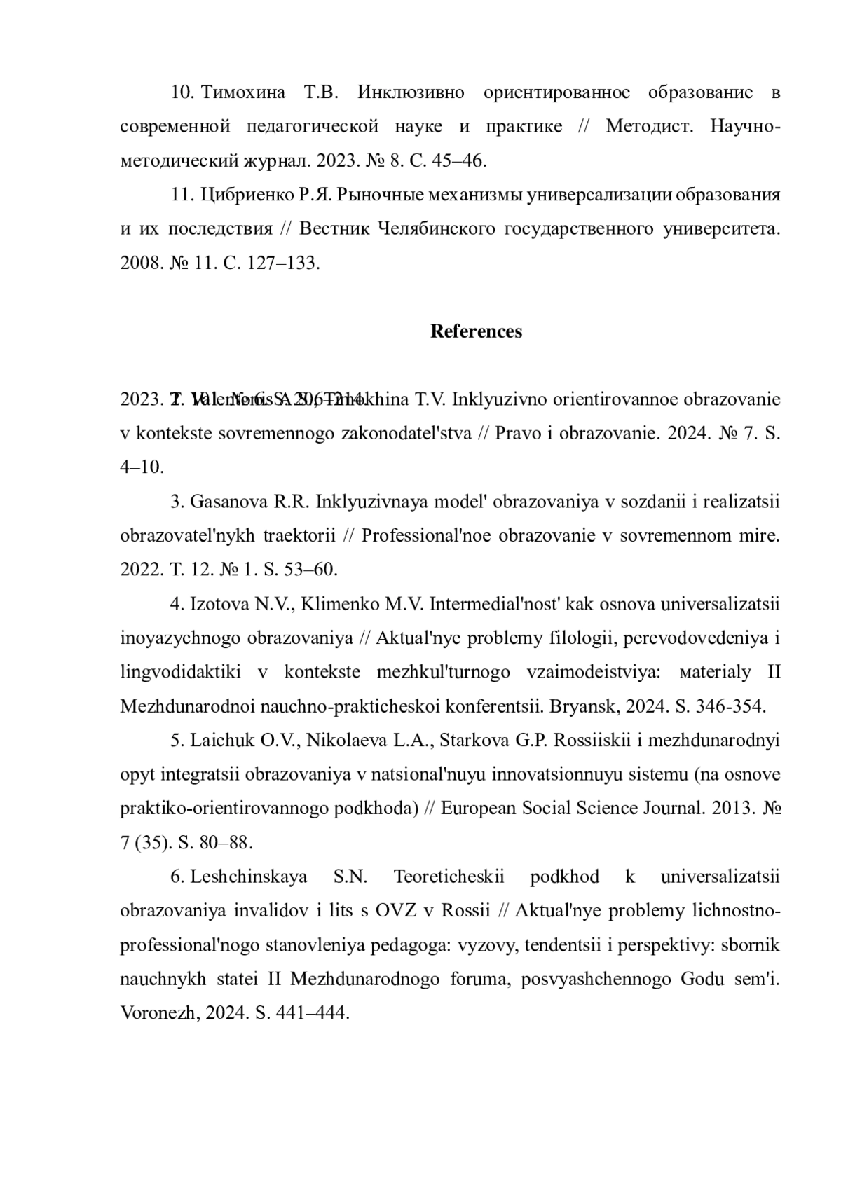 10. Тимохина Т.В. Инклюзивно ориентированное образование в современной педагогической науке и практике // Методист. Научно-методический журнал. 2023. № 8. С. 45-46.
