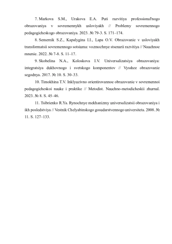 7. Маркова С.М., Уракова Е.А. Пути развития профессионального образования в современных условиях // Проблемы современного педагогического образования. 2023. № 79-3. С. 171-174. EDN: VMIIAC