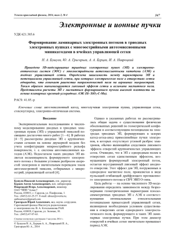 Бушуев Н. А., Григорьев Ю. А., Бурцев А. А., Навроцкий И. А. Формирование ламинарных электронных потоков в триодных электронных пушках с многоострийными автоэмиссионными миникатодами в ячейках управляющей сетки 347
