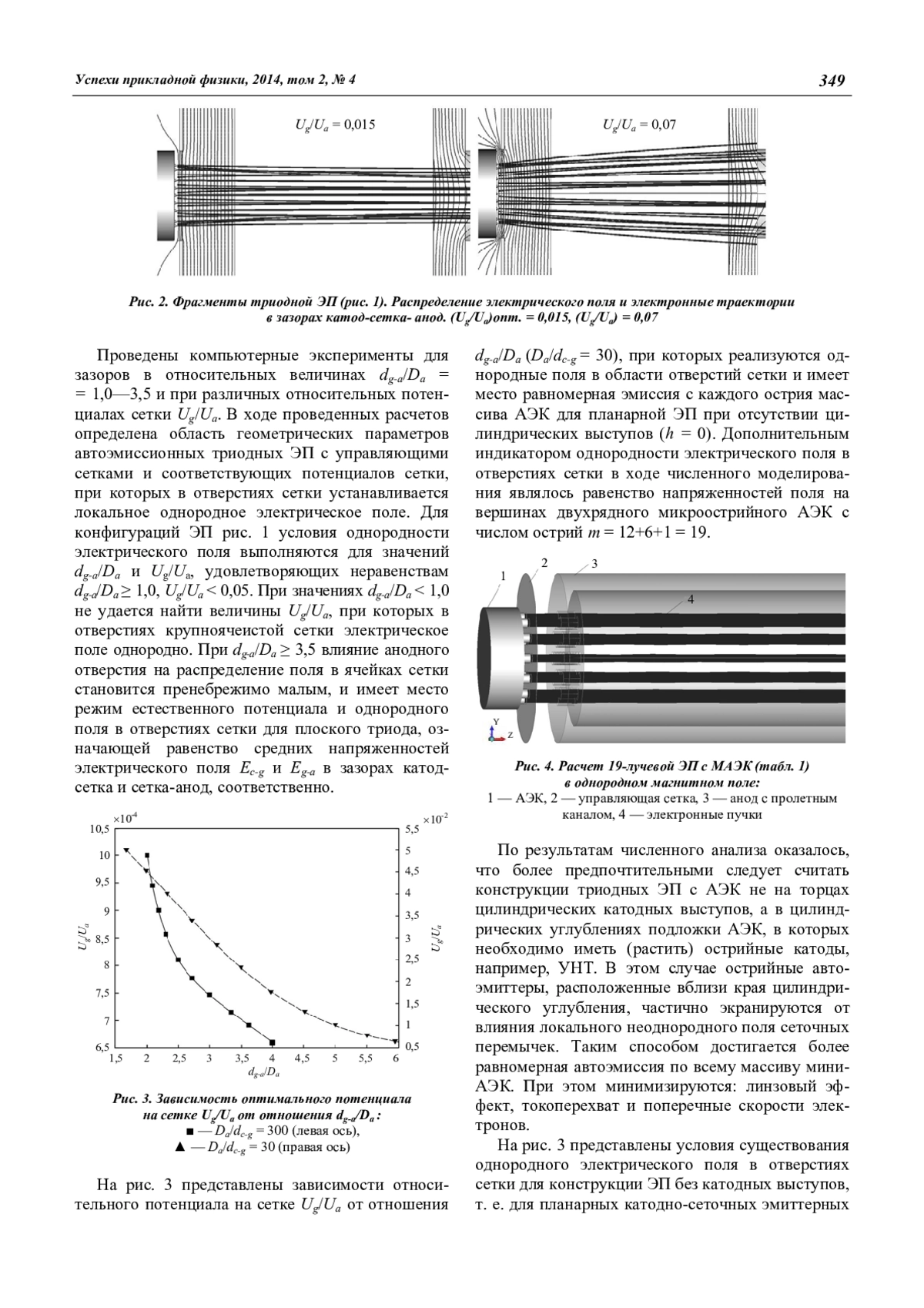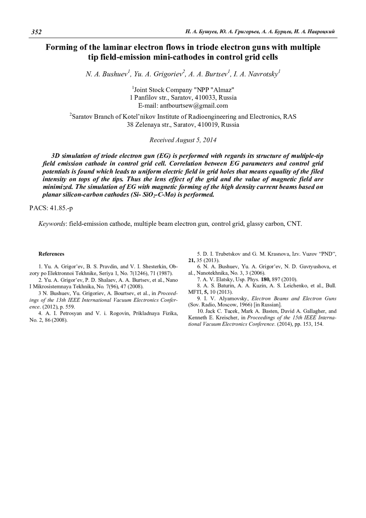 N. A. Bushuev, Yu. A. Grigoriev, A. A. Burtsev, I. A. Navrotsky Forming of the laminar electron flows in triode electron guns with multiple tip field-emission mini-cathodes in control grid cells 347