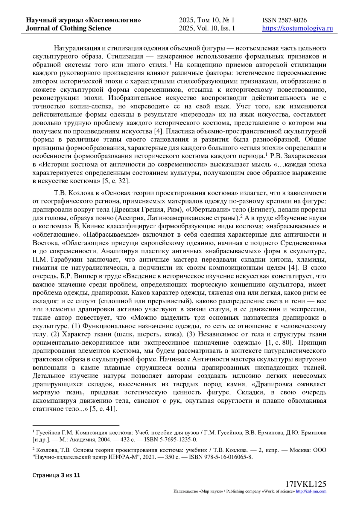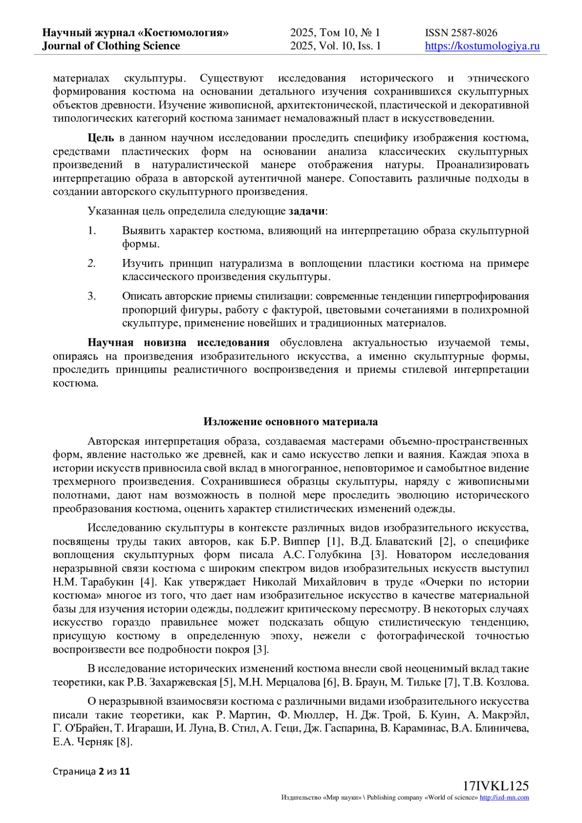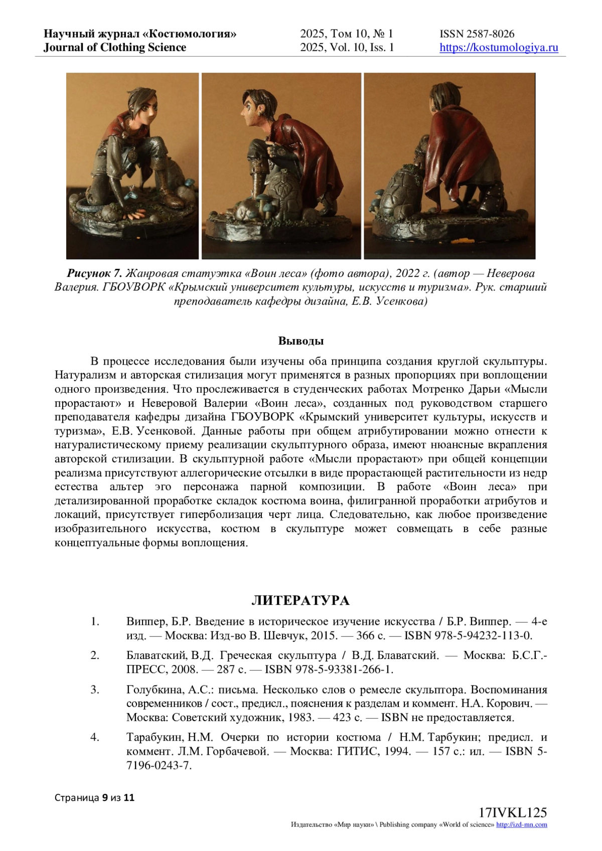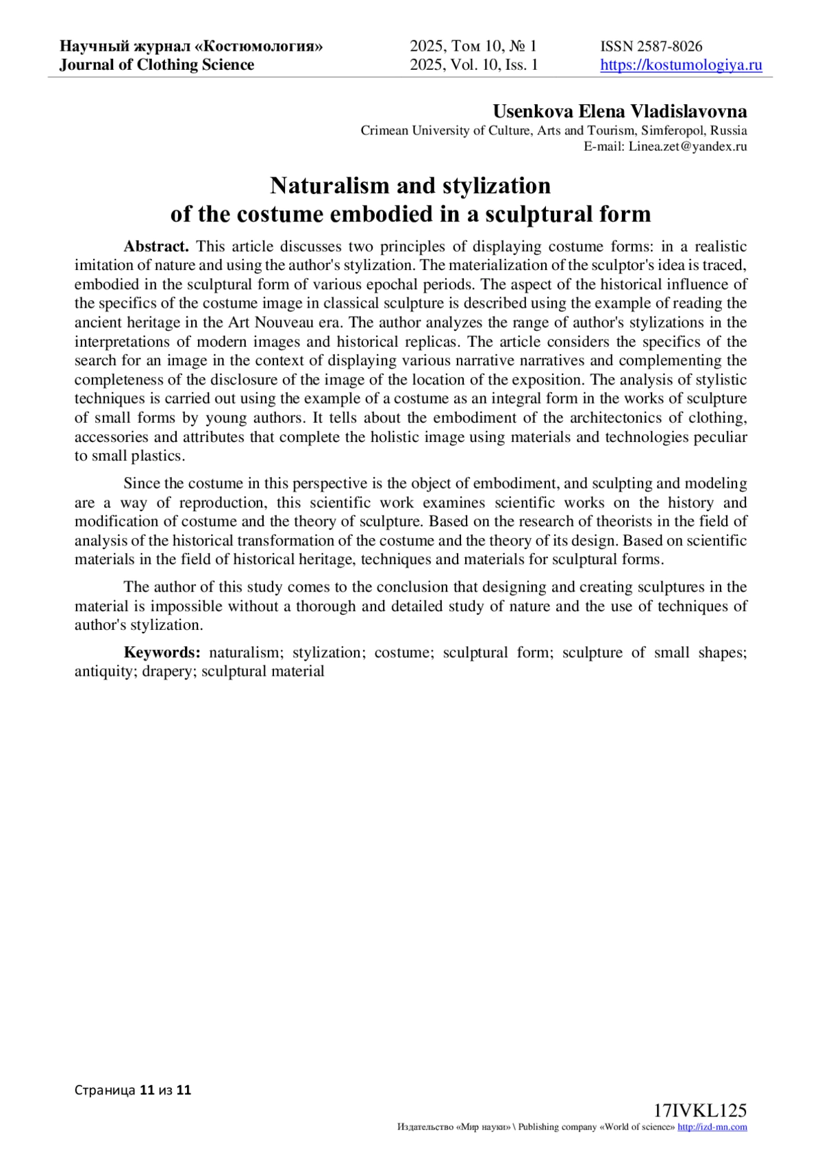 В данной статье рассматривается два принципа отображения костюмных форм: в реалистичном копировании натуры и с применением авторской стилизации. Прослеживается материализация идеи ваятеля, воплощенная в скульптурной форме разных эпох. Описывается аспект исторического влияния специфики изображения костюма в классической скульптуре на примере прочтения античного наследия в эпоху арт-нуво. Анализируется спектр авторских стилизаций в интерпретациях образов современности и исторических репликах. Рассматривается специфика поиска образа, в контексте отображения различных сюжетных повествований и дополняющие полноту раскрытия образа локации экспозиции. Проводится анализ стилистических приемов на примере костюма, как цельной формы в работах скульптуры малых форм молодых авторов. Повествуется о воплощении архитектоники одеяния, аксессуаров и атрибутов, довершающих целостный образ с применением материалов и технологий, свойственных малой пластике. Поскольку костюм в данном ракурсе является предметом воплощения, а ваяние и лепка способом воспроизведения, в данной научной работе исследуются научные труда по истории и модификации костюма и теории скульптуры. Опираясь на исследования теоретиков в области анализ исторической трансформации костюма и теории его проектирования. Основываясь на научные материалы в области исторического наследия, методиках и материалах выполнения скульптурных форм. Автор данного исследования приходит к выводу, что проектирование и создание в материале произведений скульптуры невозможно без тщательного и детального изучения натуры и применения приемов авторской стилизации.