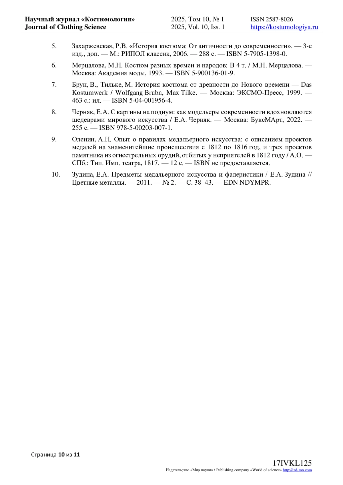 10. Зудина, Е.А. Предметы медальерного искусства и фалеристики / Е.А. Зудина // Цветные металлы. - 2011. - № 2. - С. 38-43. EDN: NDYMPR