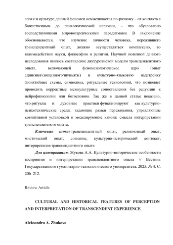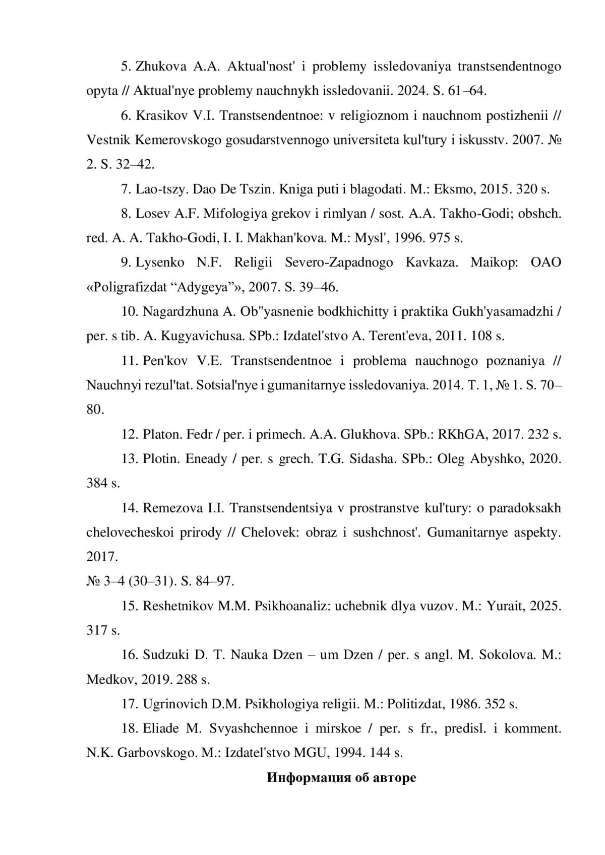 5. Жукова А.А. Актуальность и проблемы исследования трансцендентного опыта // Актуальные проблемы научных исследований. 2024. С. 61-64. EDN: SYGVJJ