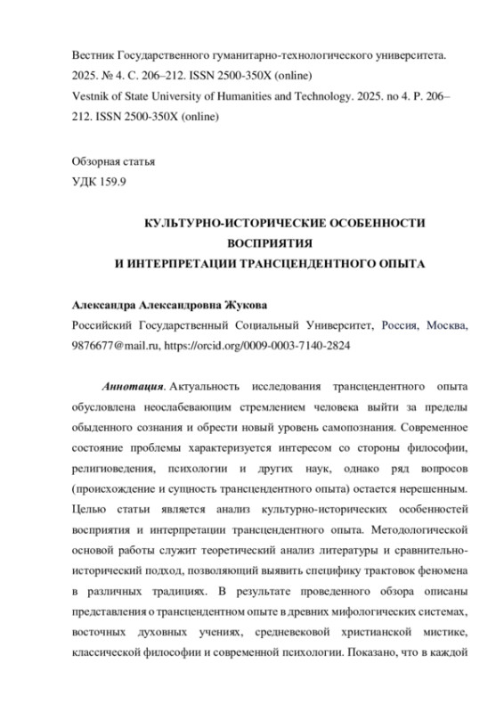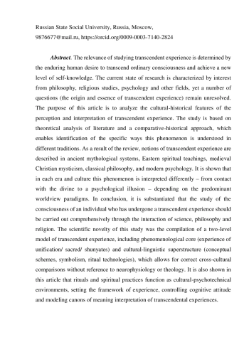 Актуальность исследования трансцендентного опыта обусловлена неослабевающим стремлением человека выйти за пределы обыденного сознания и обрести новый уровень самопознания. Современное состояние проблемы характеризуется интересом со стороны философии, религиоведения, психологии и других наук, однако ряд вопросов (происхождение и сущность трансцендентного опыта) остается нерешенным. Целью статьи является анализ культурно-исторических особенностей восприятия и интерпретации трансцендентного опыта. Методологической основой работы служит теоретический анализ литературы и сравнительно-исторический подход, позволяющий выявить специфику трактовок феномена в различных традициях. В результате проведенного обзора описаны представления о трансцендентном опыте в древних мифологических системах, восточных духовных учениях, средневековой христианской мистике, классической философии и современной психологии. Показано, что в каждой эпохе и культуре данный феномен осмысливается по-разному - от контакта с божественным до психологической иллюзии, - что обусловлено господствующими мировоззренческими парадигмами. В заключение обосновывается, что изучение личности человека, пережившего трансцендентный опыт, должно осуществляться комплексно, во взаимодействии науки, философии и религии. Научной новизной данного исследования явилось составление двухуровневой модели трансцендентного опыта, включающей феноменологическое ядро (опыт единения/священного/шуньяты) и культурно-языковую надстройку (понятийные схемы, символика, ритуальные технологии), что позволяет проводить корректные межкультурные сопоставления без редукции к нейрофизиологии или богословию. Так же в данной статье показано, что ритуалы и духовные практики функционируют как культурно-психотехнические среды, задающие рамки переживания, управляющие когнитивной установкой и моделирующие каноны смысла интерпретации трансцендентного опыта.