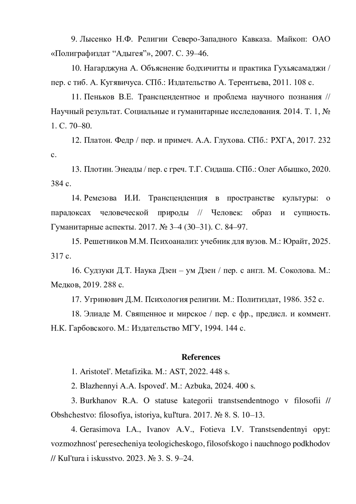 4. Герасимова И.А., Иванов А.В., Фотиева И.В. Трансцендентный опыт: возможность пересечения теологического, философского и научного подходов // Культура и искусство. 2023. № 3. С. 9-24. EDN: COERDD