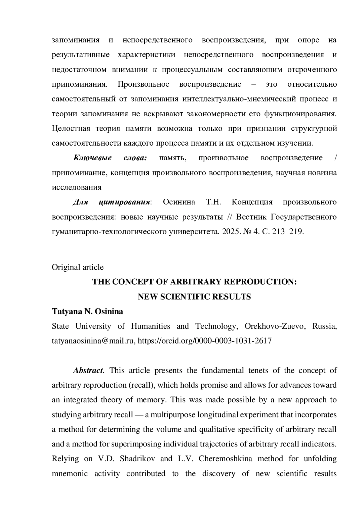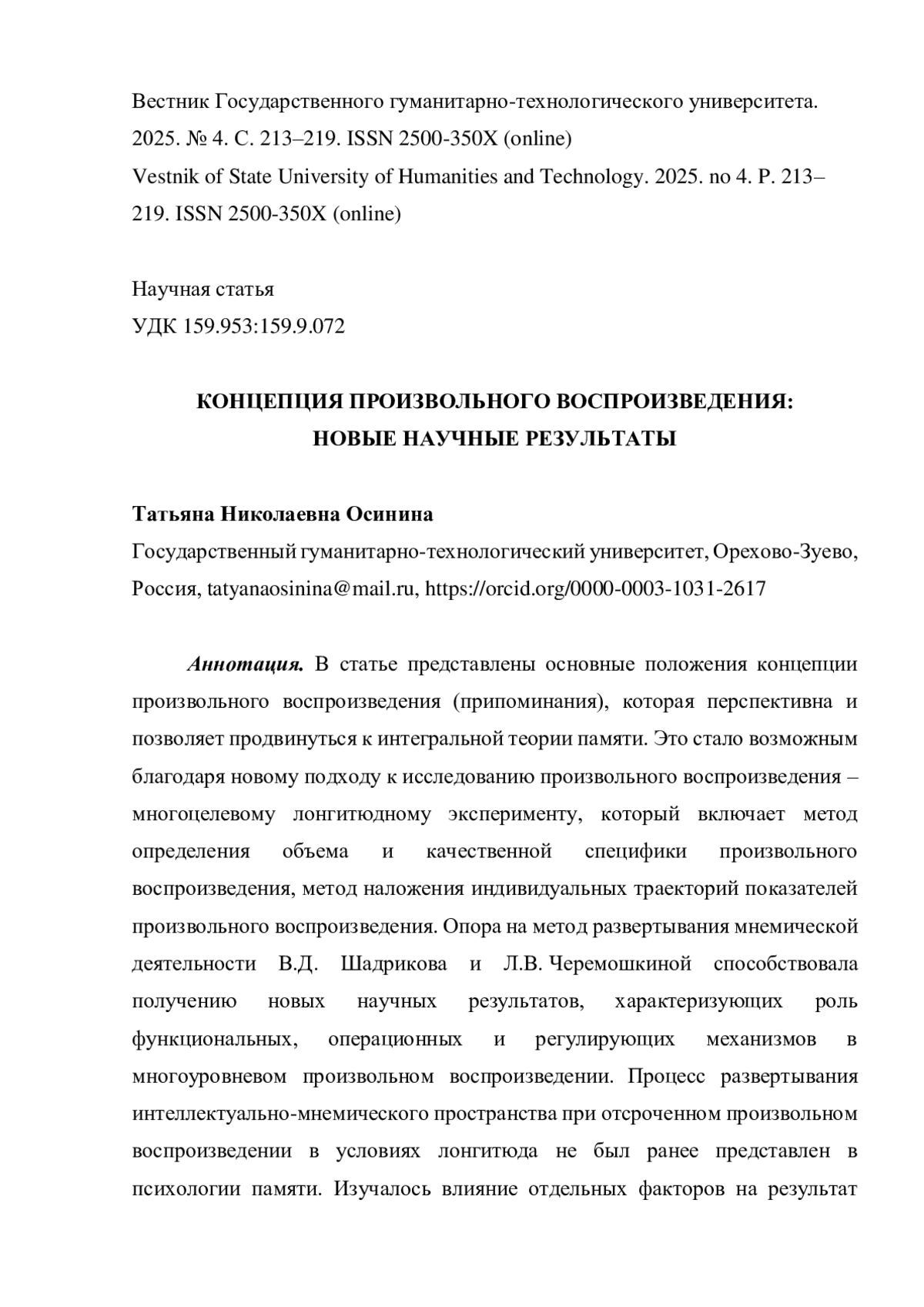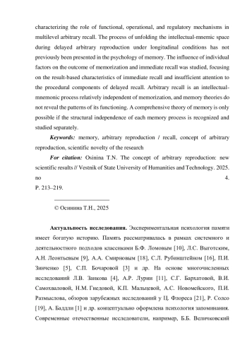 15. Осинина Т.Н. Знакомость учебного текста как фактор эффективности произвольного воспроизведения // Психология обучения. 2023. № 1. С. 96-103. EDN: UOULJI