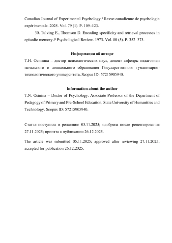 30. Tulving E., Thomson D. Encoding specificity and retrieval processes in episodic memory // Psychological Review. 1973. Vol. 80 (5). Р. 352-373.