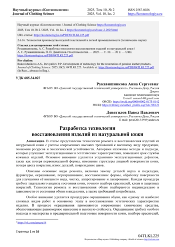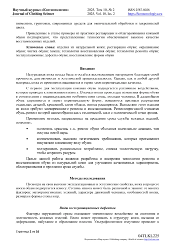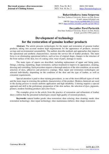 В статье представлены технологии ремонта и восстановления изделий из натуральной кожи с учетом современных высоких требований к внешнему виду продукции, экономии ресурсов и экологической устойчивости. Авторами изложены методы и подходы, которые улучшают эксплуатационные и эстетические характеристики, повышают срок службы кожаных изделий. Основное внимание уделяется устранению эксплуатационных дефектов, таких как потеря первоначальной формы, изменение структуры лицевой поверхности кожи, потеря цвета покрытия, износ деталей, повреждение швов. Описаны основные виды ремонта, включая замену деталей верха и подкладки, фурнитуры, окрашивание, перекрашивание, восстановление формы, обработку поверхности для улучшения её внешнего вида, чистку, аппретирование и лакирование. Каждая процедура требует тщательного анализа состояния кожи, точного подбора красителей, клеев и защитных покрытий. Технологии ремонта и восстановления обуви подбираются индивидуально в зависимости от состояния обуви и вида кожи, а также требований потребителя. Особое внимание уделяется процедурам окрашивания обуви, как одному из наиболее сложных видов работ и основному этапу в восстановлении эстетических характеристик изделия. В процессе окрашивания применяются современные химические средства, обеспечивающие равномерное нанесение и высокую стойкость. Окрашивание требует особого подхода и мастерства в предварительной подготовке поверхности кожи, подборе красителей, пигментов, грунтовки, современных средств для окончательной обработки и закрепителей цвета. Приведенные в статье примеры из практики реставрации и облагораживания кожаной обуви подтверждают, что представленные технологии обеспечивают высокое качество восстановленных изделий.