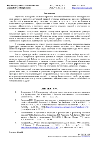 2. Леденева И.Н. Концепция реставрации и восстановления эксплуатационных свойств обуви / И.Н. Леденева, Р.С. Панов, Г.О. Барбашев. // Промышленные процессы и технологии. - 2024. Т. 4, № 4(14). - С. 31-38. - URL: https://ojs.iptjournal.org/index.php/ipt/article/view/154 (дата обращения 10.02.2025). DOI: 10.37816/2713-0789-2024-4-4(14)-31-38 EDN: FVUYES
