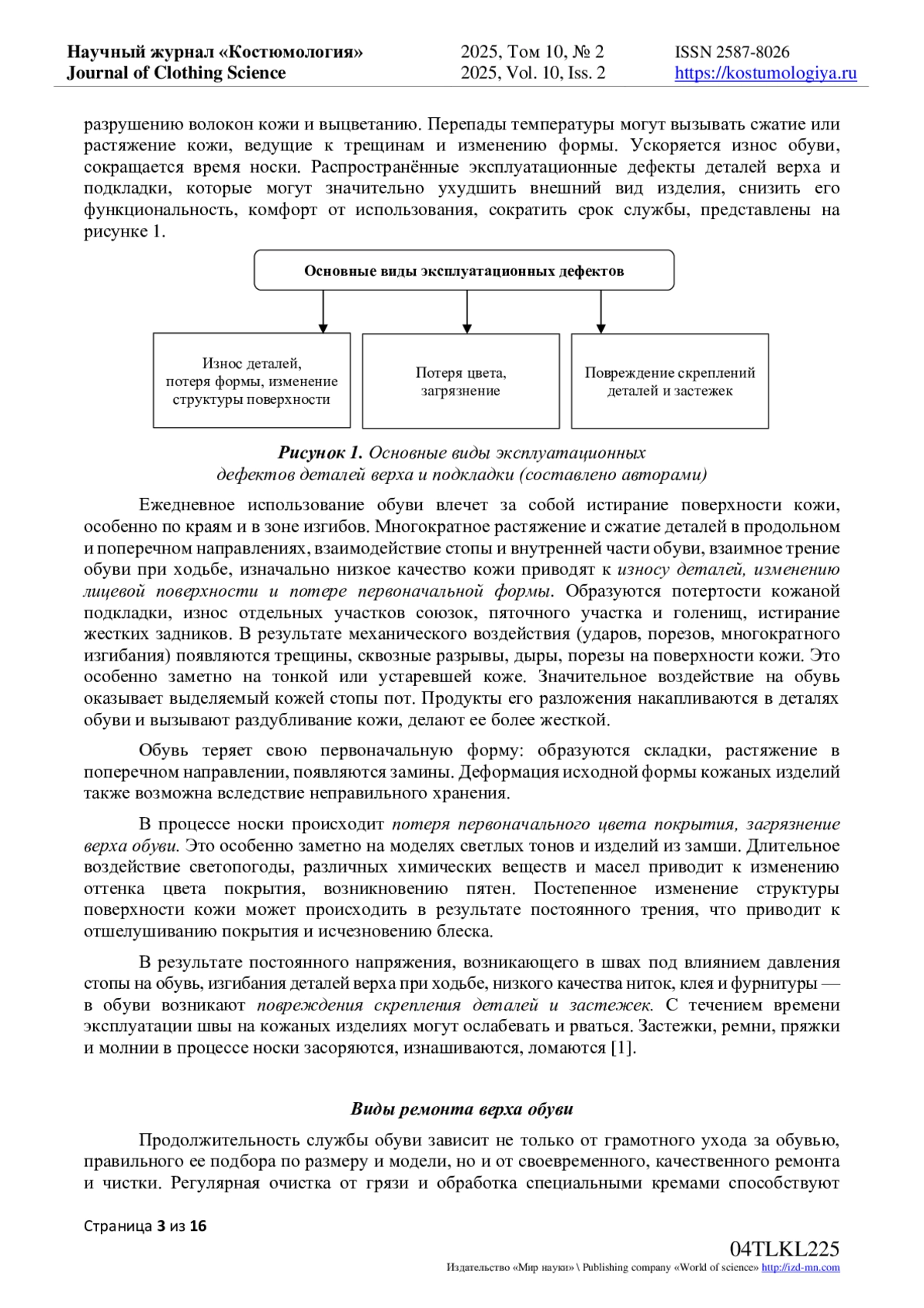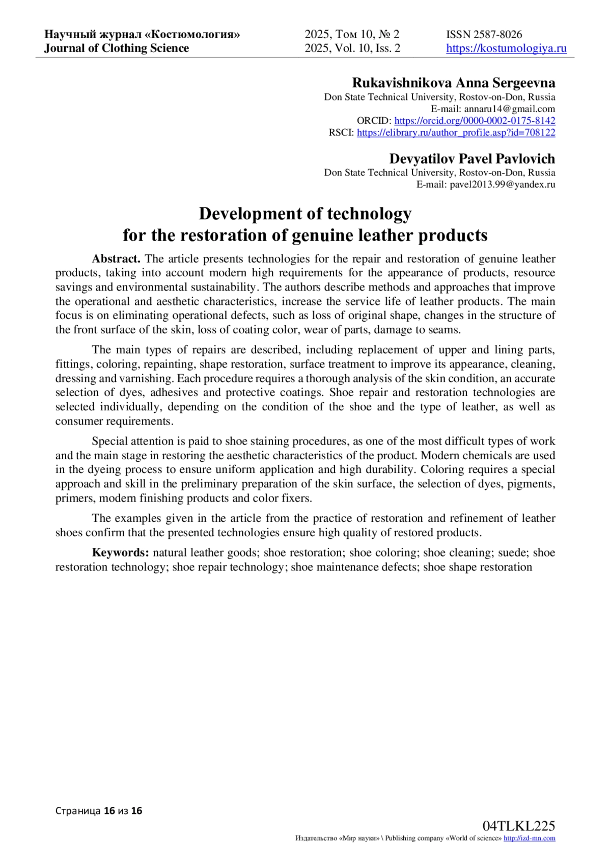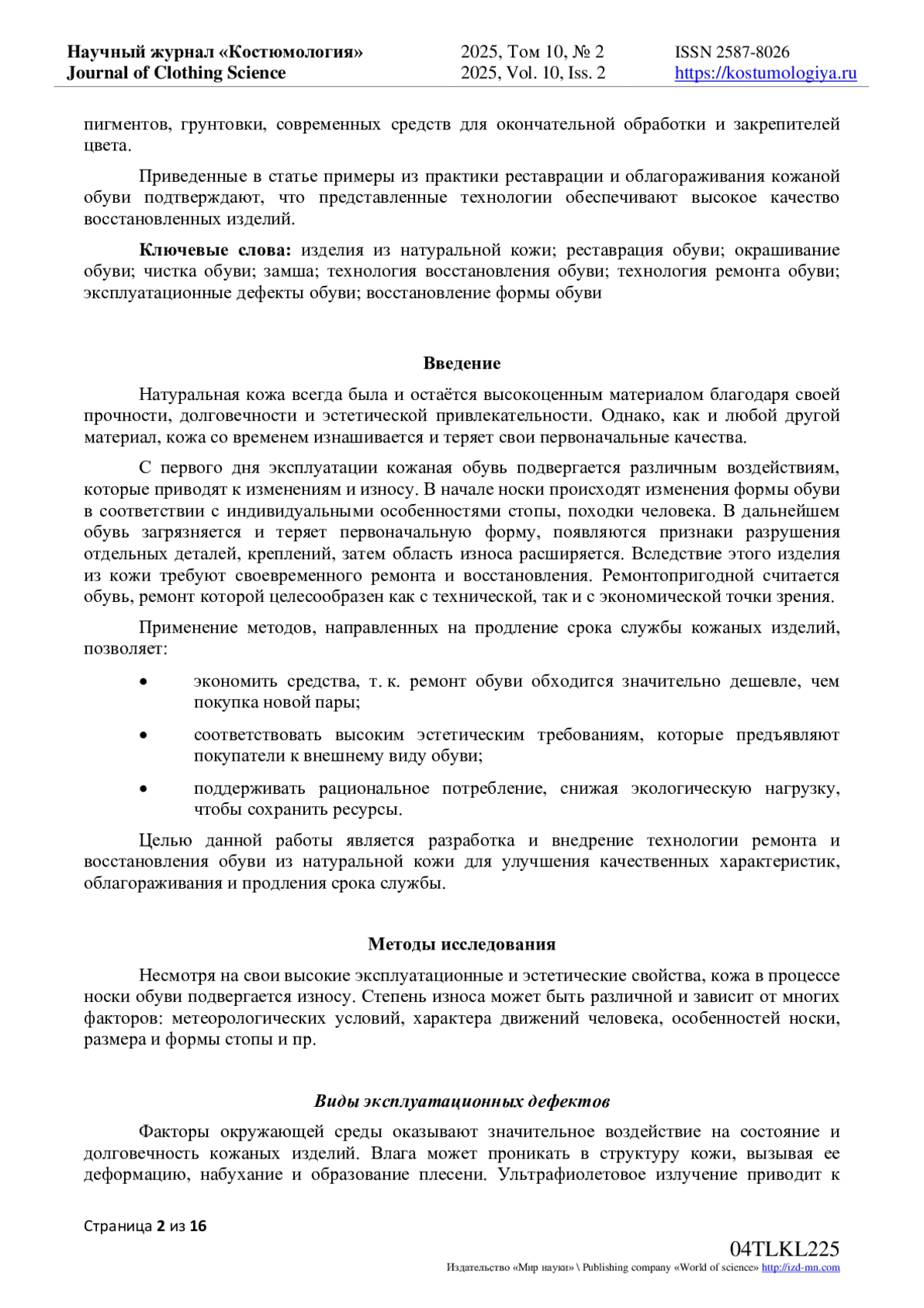 6. Ревников Л.В. Разработка системного подхода при реставрации лицевого слоя натуральных обувных кож с целью сохранения целостного образа изделия / Л.В. Ревников, Е.А. Кирсанова, И.Р. Татарчук // Научный журнал “Дизайн и технологии”, № 97(139) / Москва: Изд-во РГУ имени А.Н. Косыгина. pic/1pix.gif- 2023, С. 45-53. EDN: ICWRWL