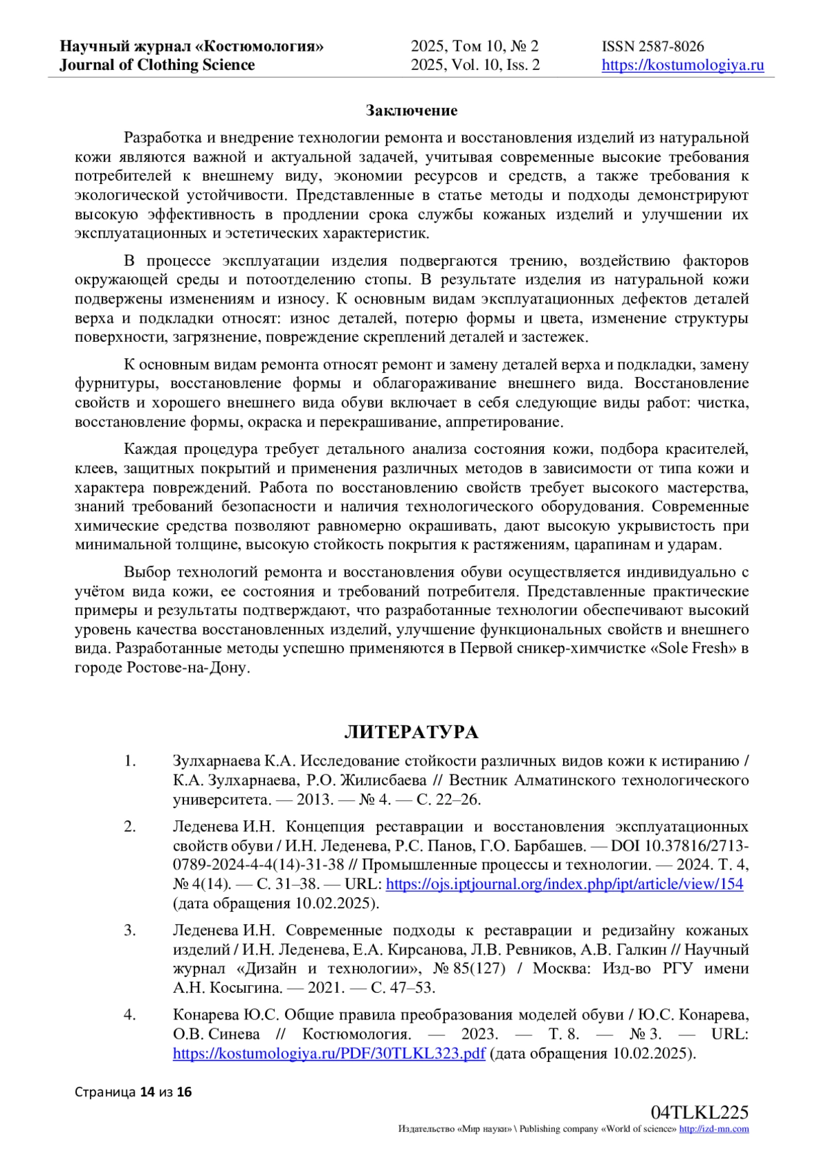 3. Леденева И.Н. Современные подходы к реставрации и редизайну кожаных изделий / И.Н. Леденева, Е.А. Кирсанова, Л.В. Ревников, А.В. Галкин // Научный журнал “Дизайн и технологии”, № 85(127) / Москва: Изд-во РГУ имени А.Н. Косыгина. - 2021. - С. 47-53. EDN: GXLHKU